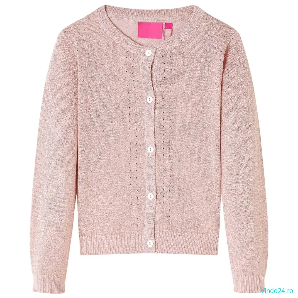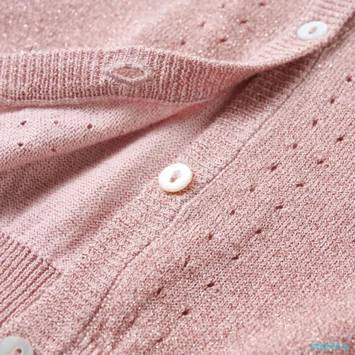 Acest cardigan pentru copii are mâneci lungi, decolteu rotund și se închide cu un rând de nasturi. Acest cardigan pentru copii este tricotat din material moale care include 97% bumbac și 3% lurex, oferind un plus de căldură și confort. Cardiganul scurt, bogat în bumbac, are margini tricotate cu striații la decolteu, manșete și tiv.