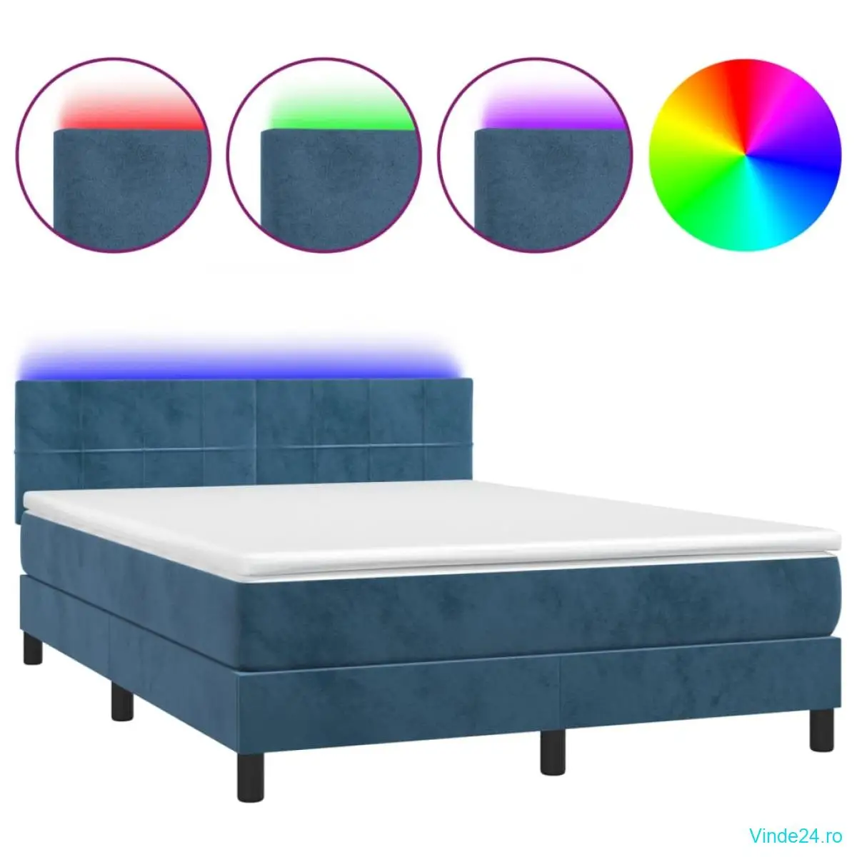 Pat cu arcuri, saltea și LED, bleumarin, 140x190 cm, catifea