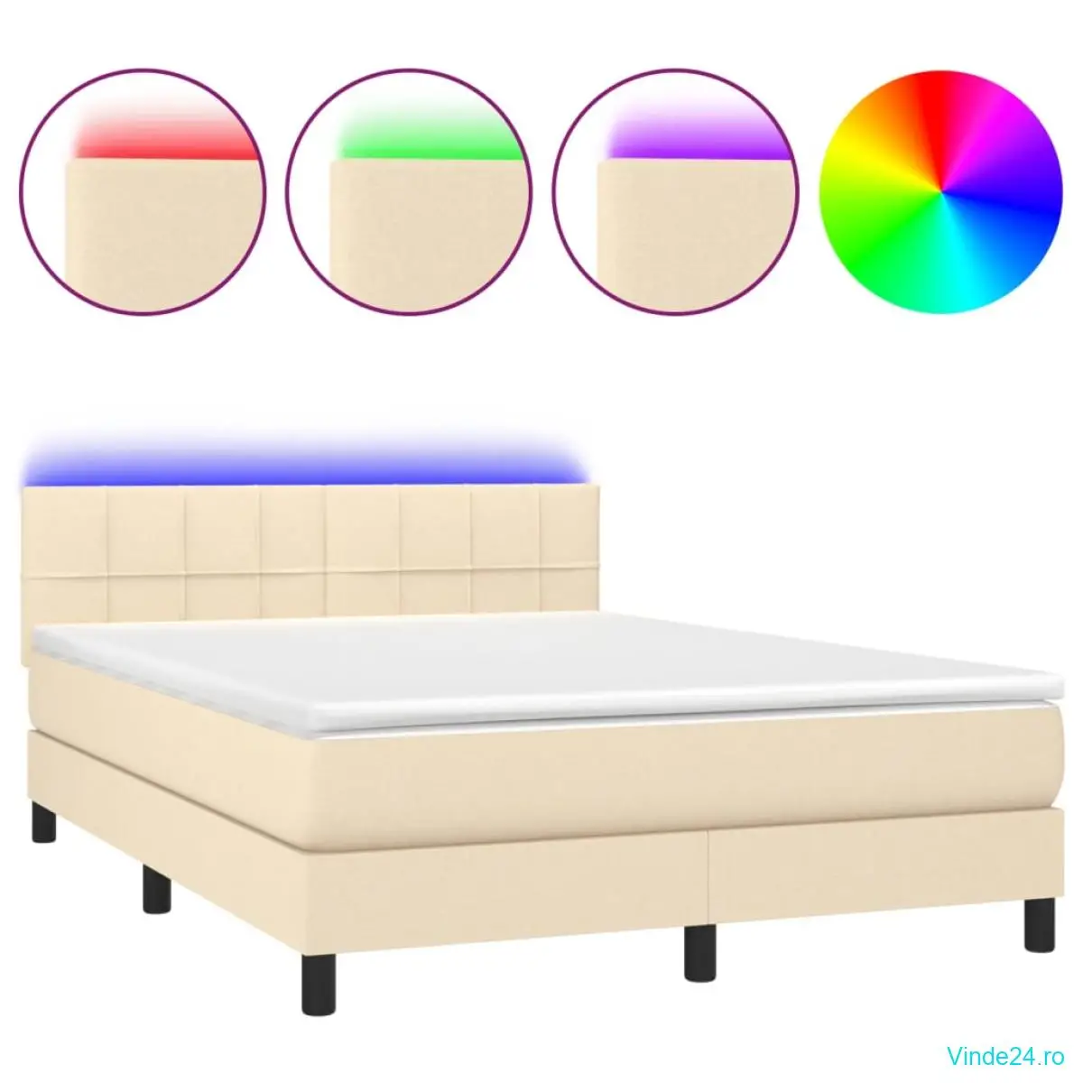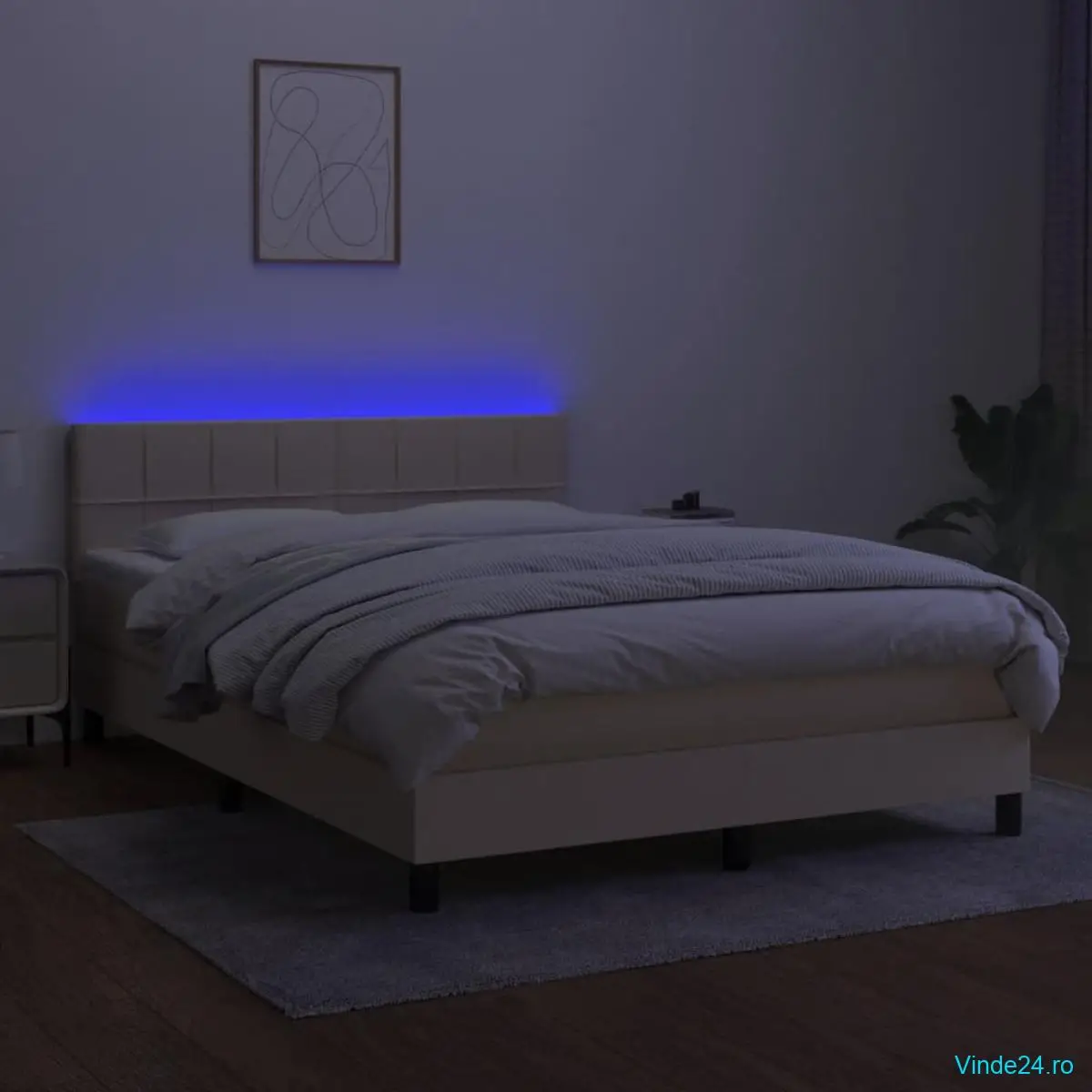 Pat cu arcuri, saltea și LED, crem, 140x190 cm, textil
