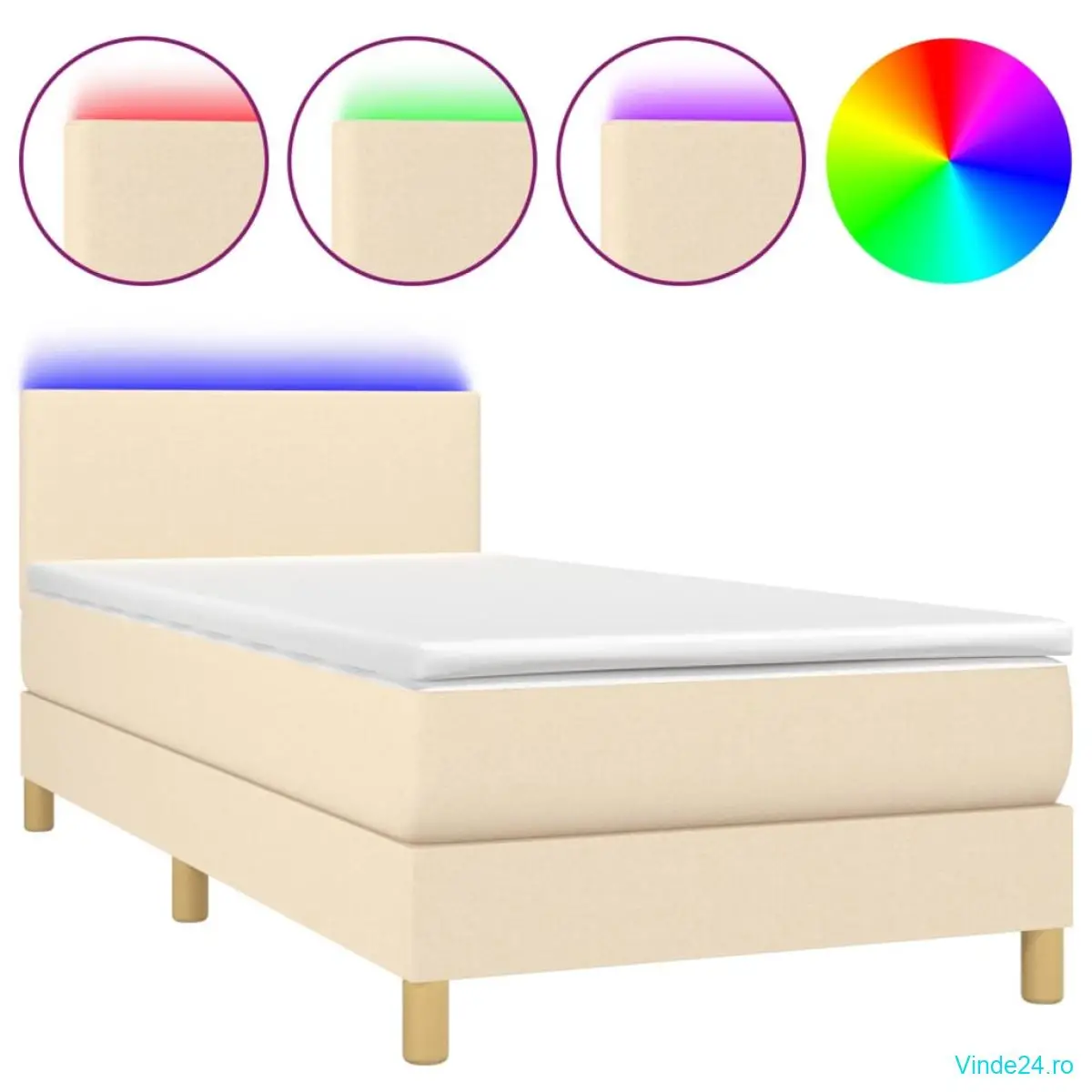 Pat cu arcuri, saltea și LED, crem, 80x200 cm, textil