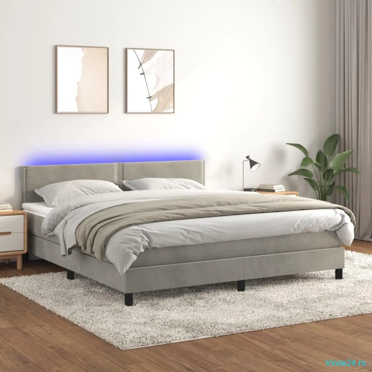 Pat cu arcuri, saltea și LED, gri deschis, 160x200 cm, catifea