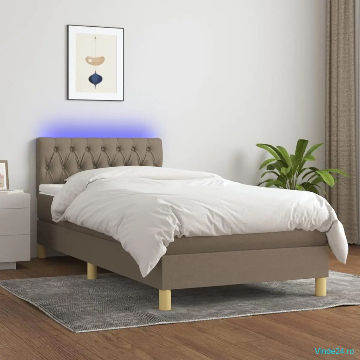 Pat cu arcuri, saltea și LED, Gri taupe, 100x200 cm, textil