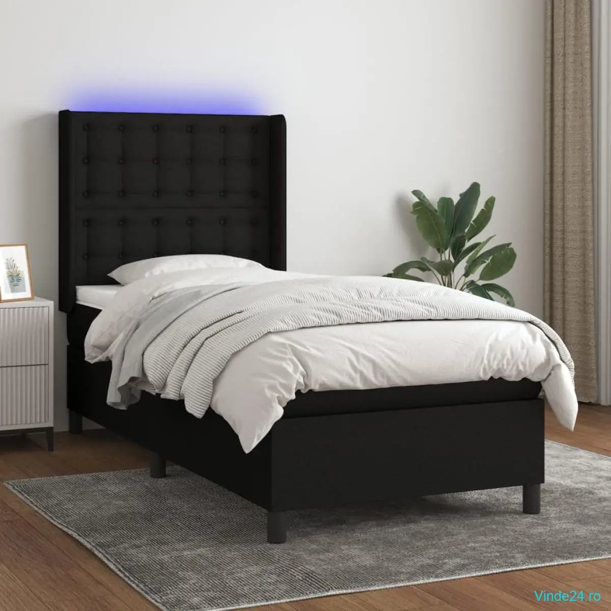 Pat cu arcuri, saltea și LED, negru, 90x190 cm, textil