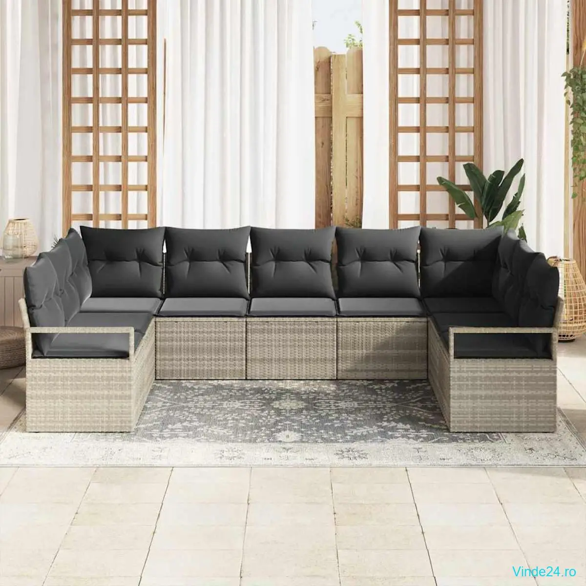 Setul ăsta de sofa secțională pentru exterior e fix ce-ți trebuie pentru relaxare în grădini sau pe terase. E o alegere super pentru întâlniri sau petreceri în aer liber. Cu un design modern, din poliratan gri deschis și perne gri închis, sofa modulară arată fantastic în orice decor, aducând un vibe fain în aer liber.
