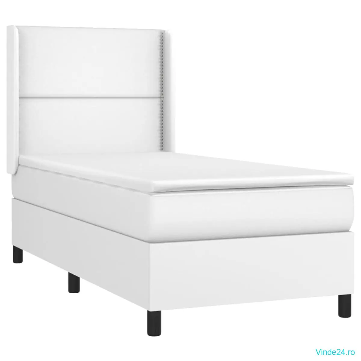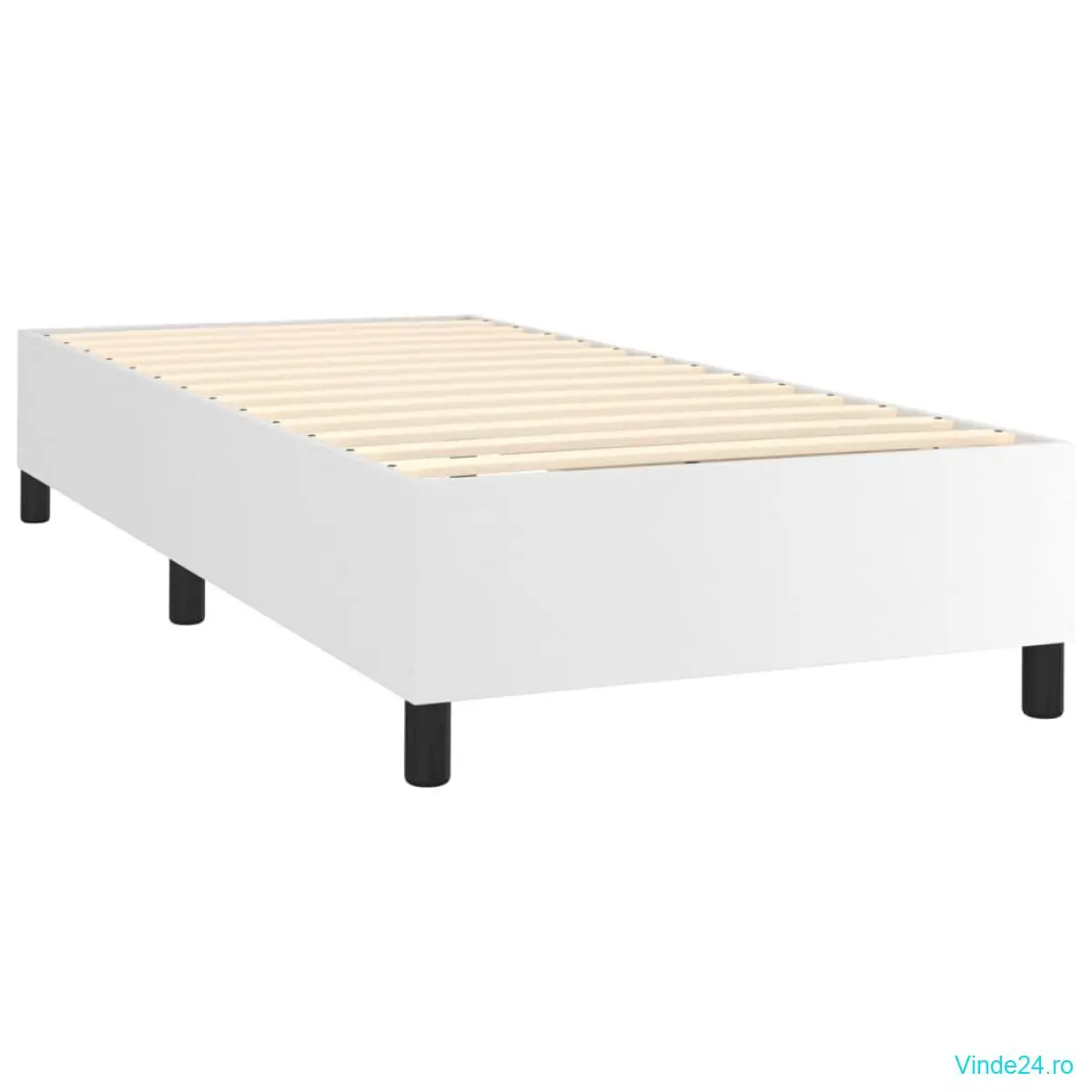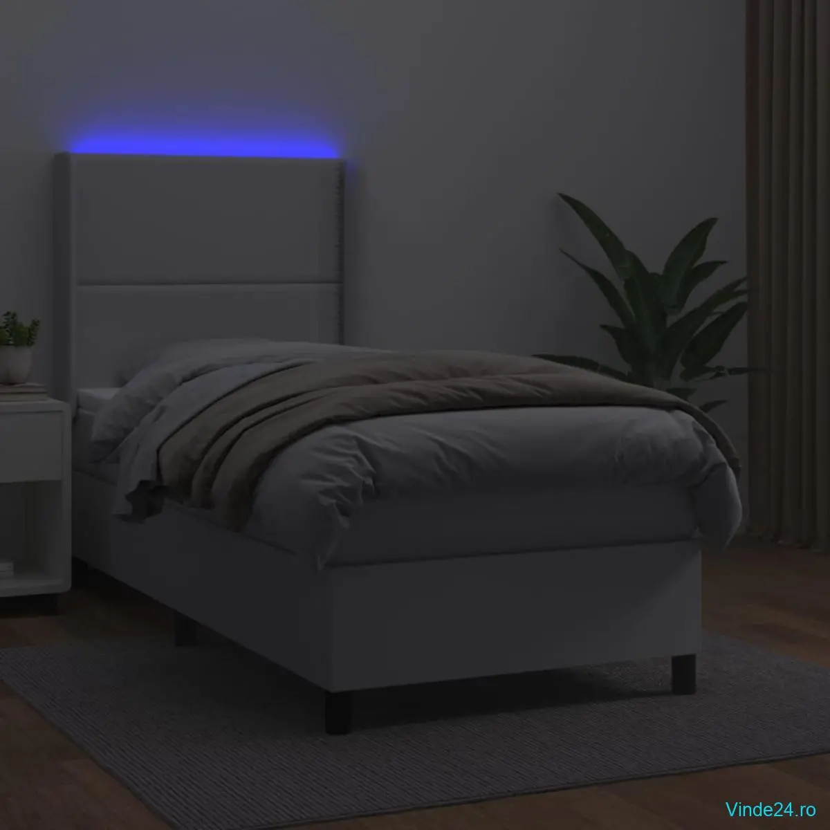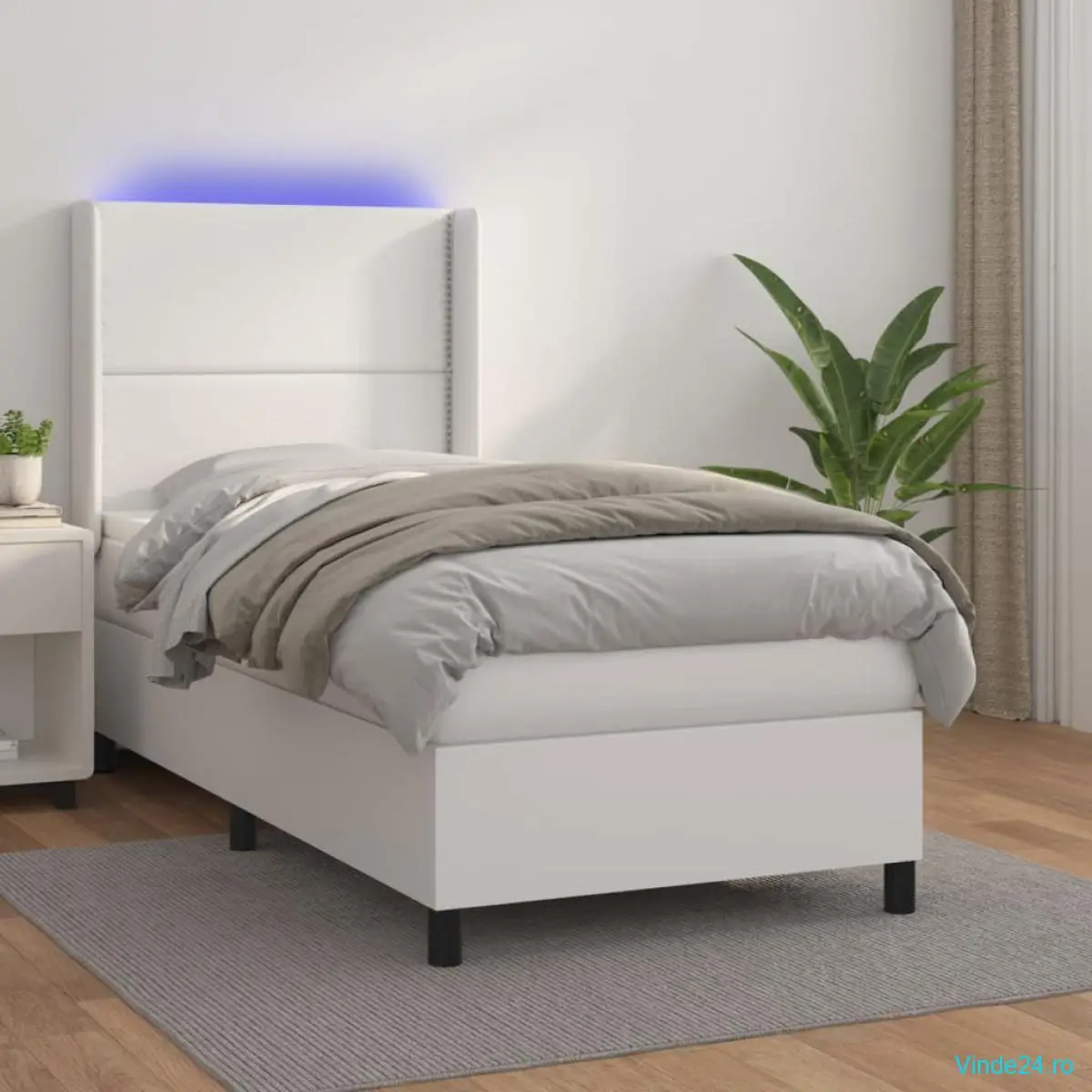 vidaXL Pat cu arcuri, cu saltea și LED, alb, 100x200 cm, piele eco