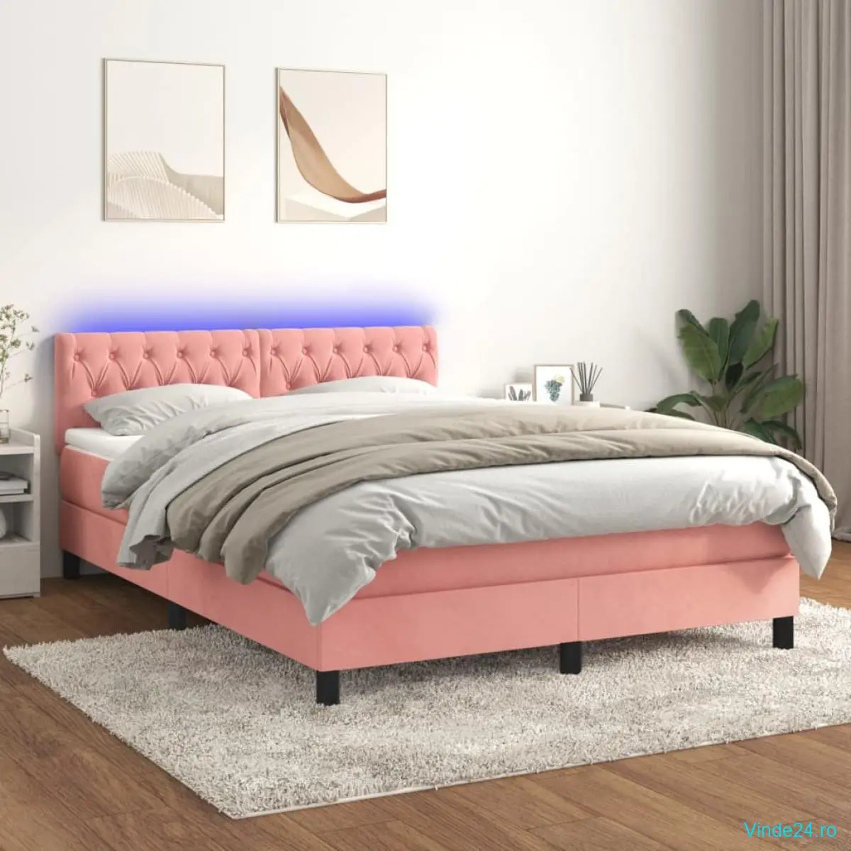 vidaXL Pat cu arcuri, cu saltea și LED, roz, 140x190 cm catifea