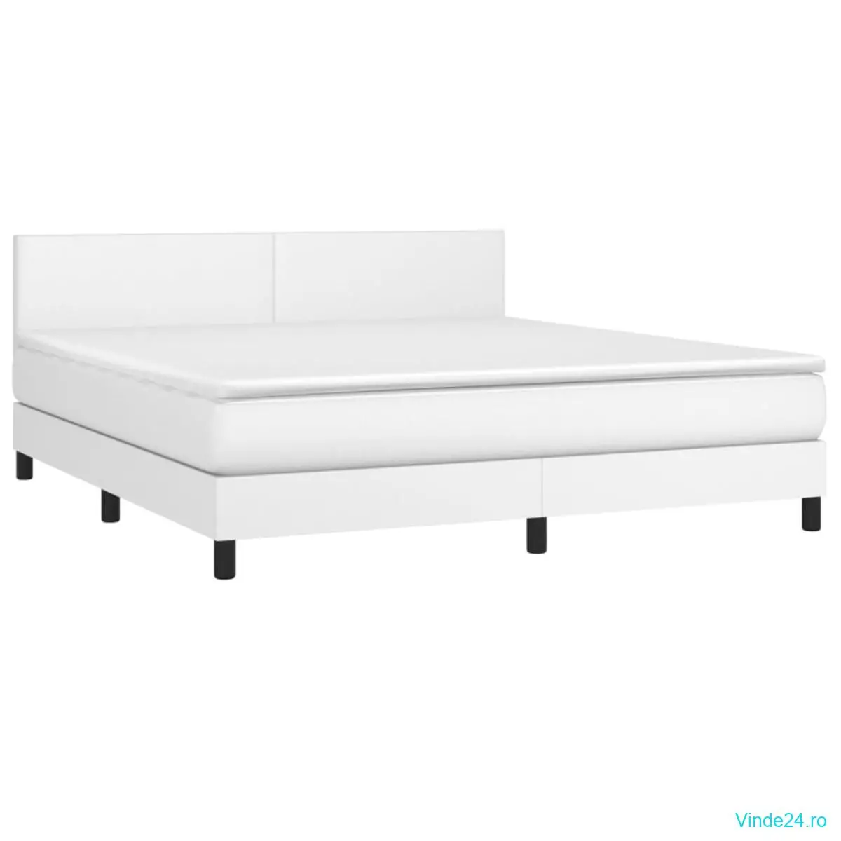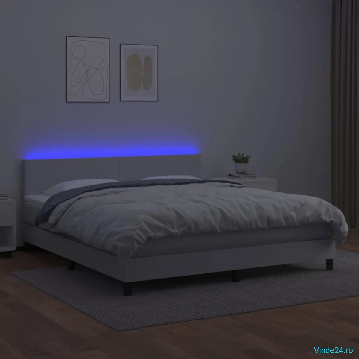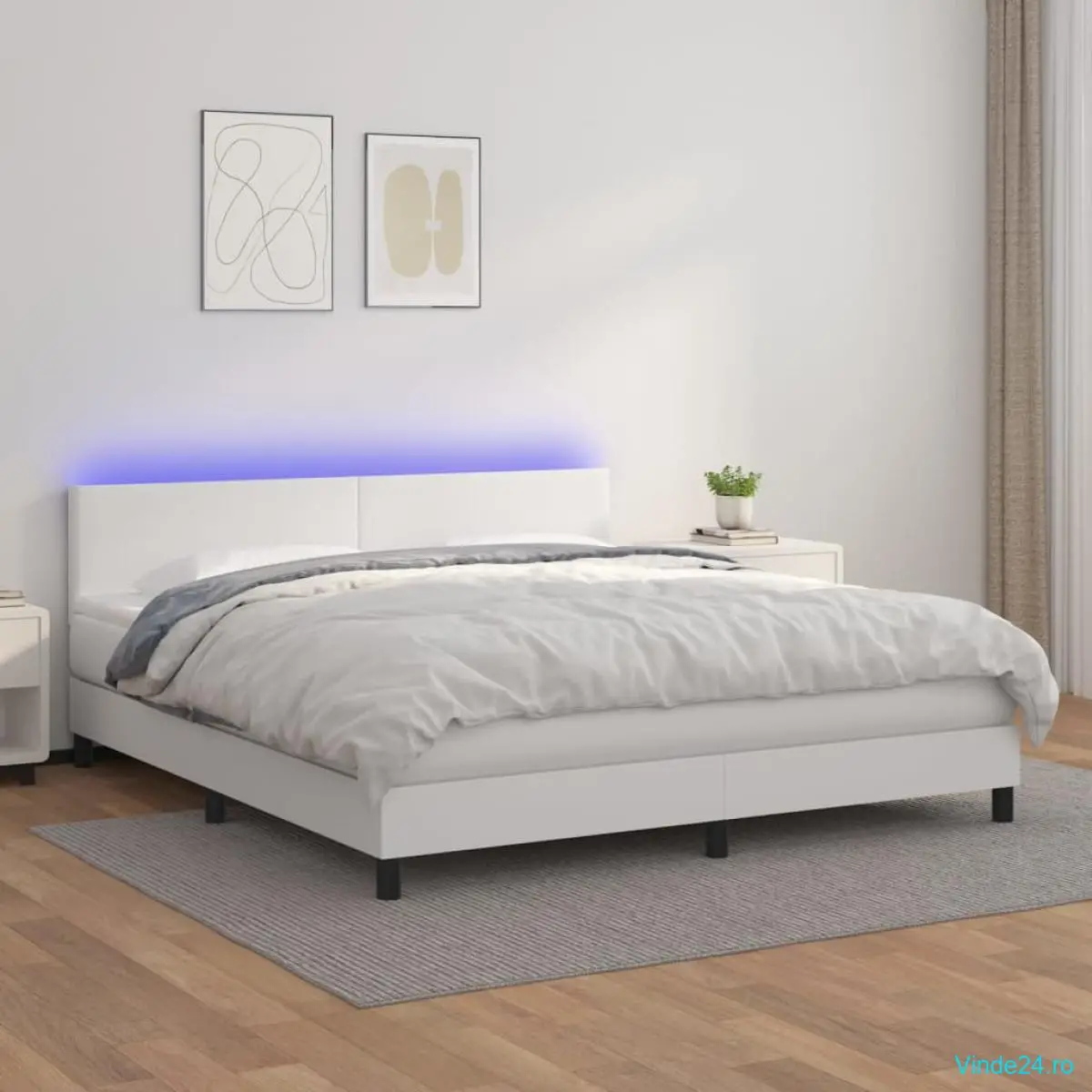 vidaXL Pat cu arcuri, saltea și LED, alb, 160x200 cm, piele ecologică