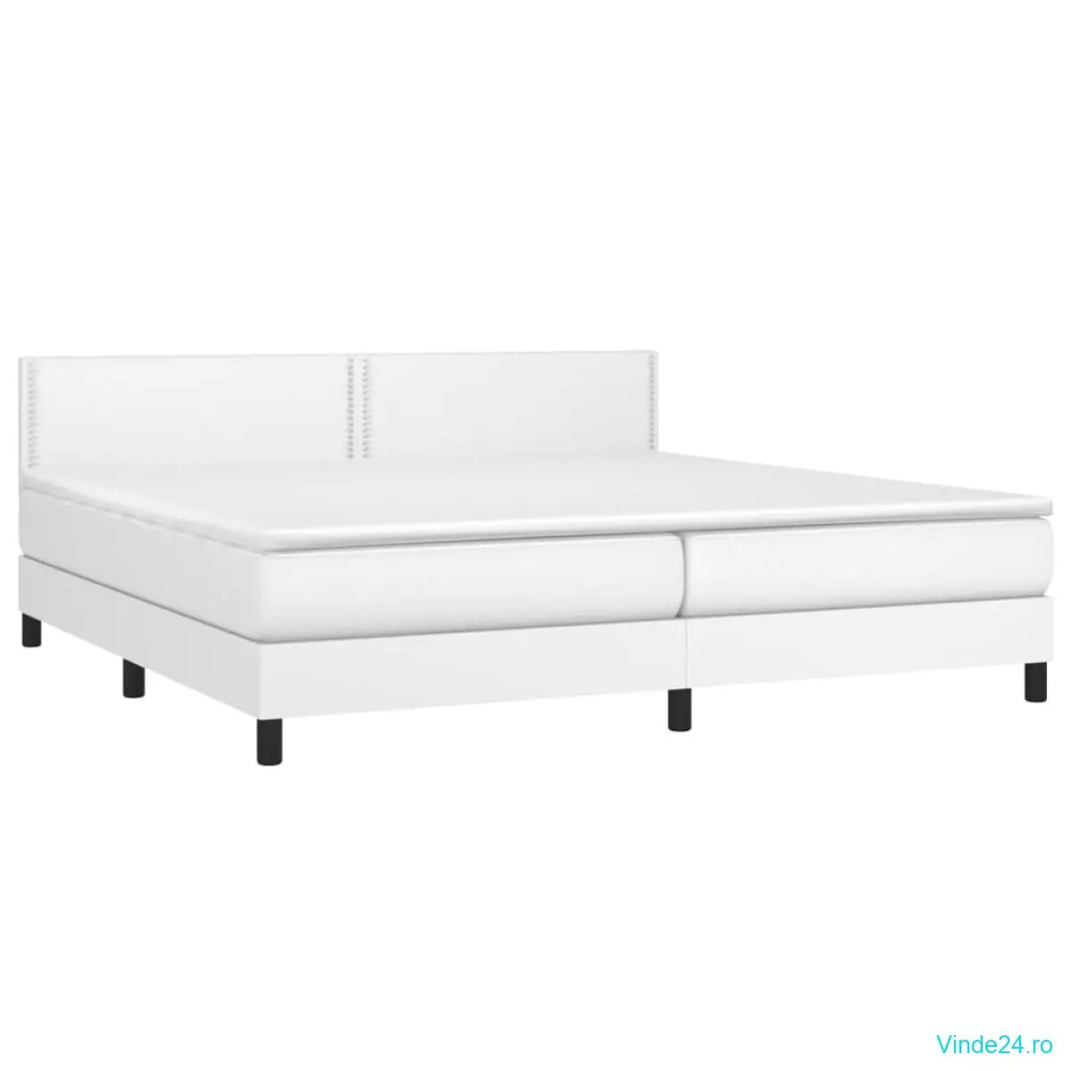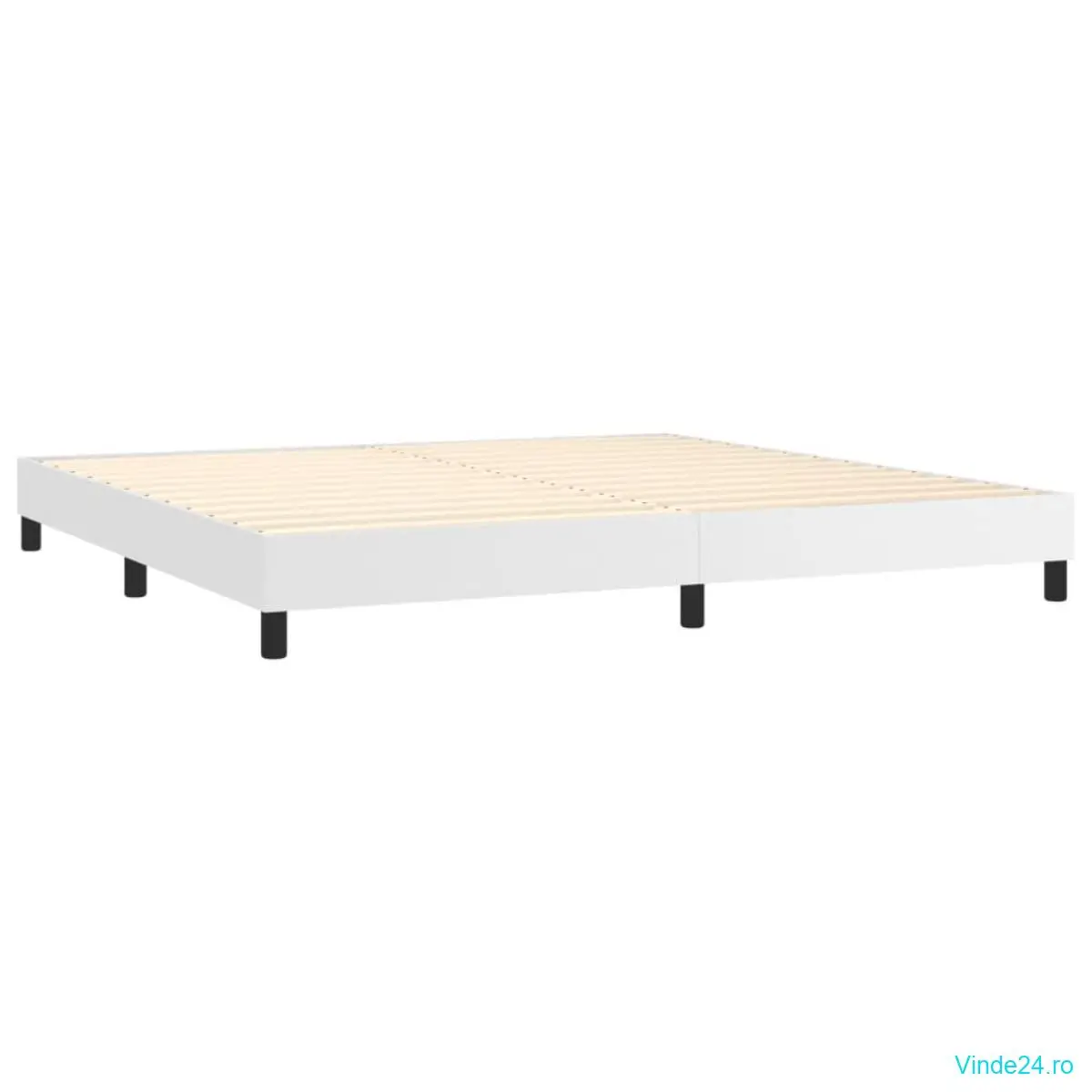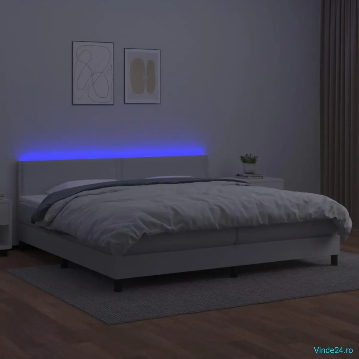 vidaXL Pat cu arcuri, saltea și LED, alb, 200x200 cm, piele ecologică