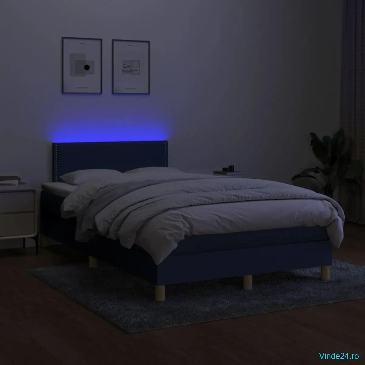 vidaXL Pat cu arcuri, saltea și LED, albastru, 120x200 cm, textil