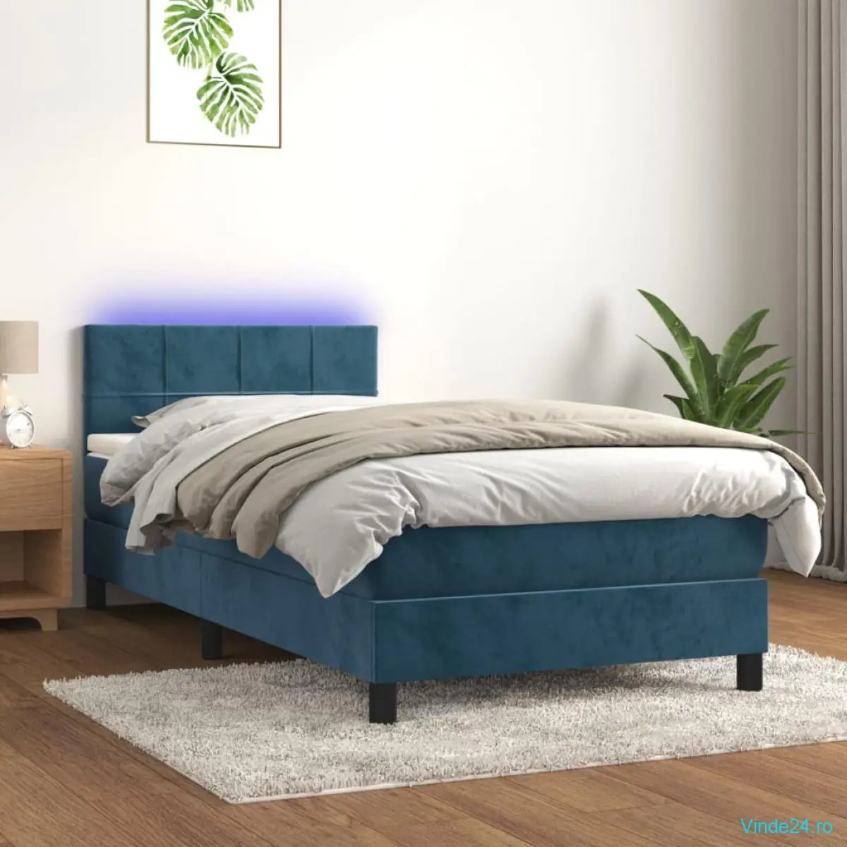 vidaXL Pat cu arcuri, saltea și LED, bleumarin, 90x200 cm, catifea