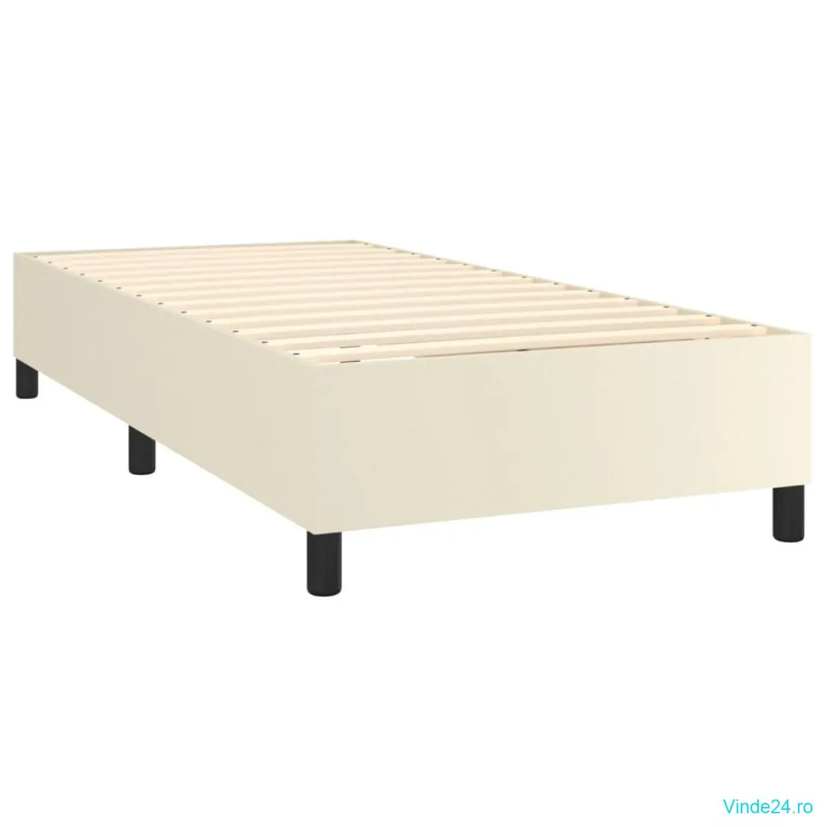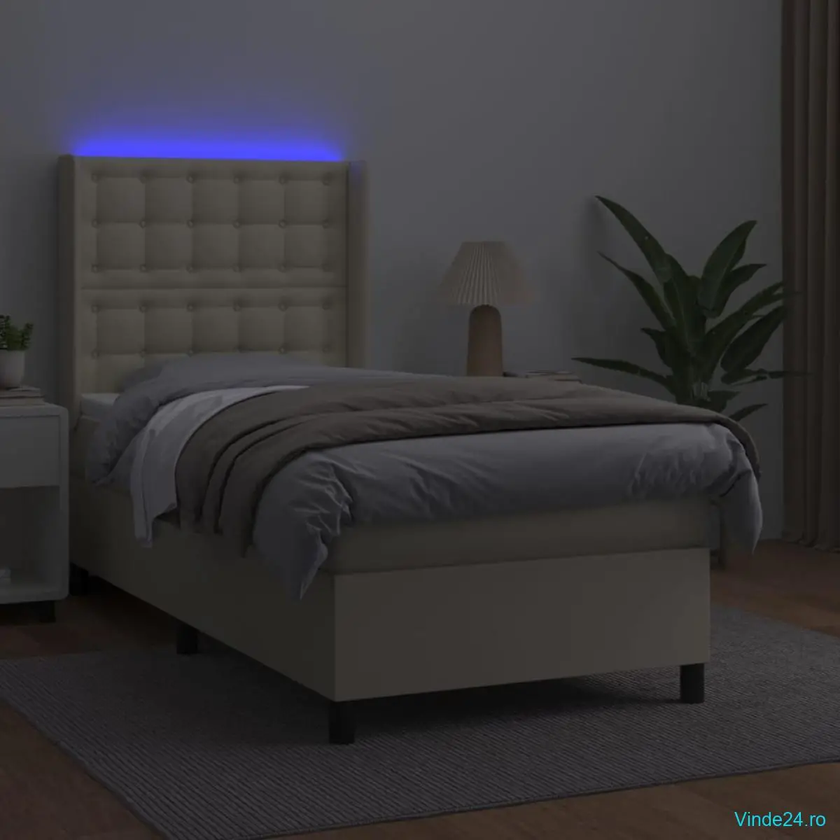 vidaXL Pat cu arcuri, saltea și LED, crem, 100x200 cm, piele ecologică