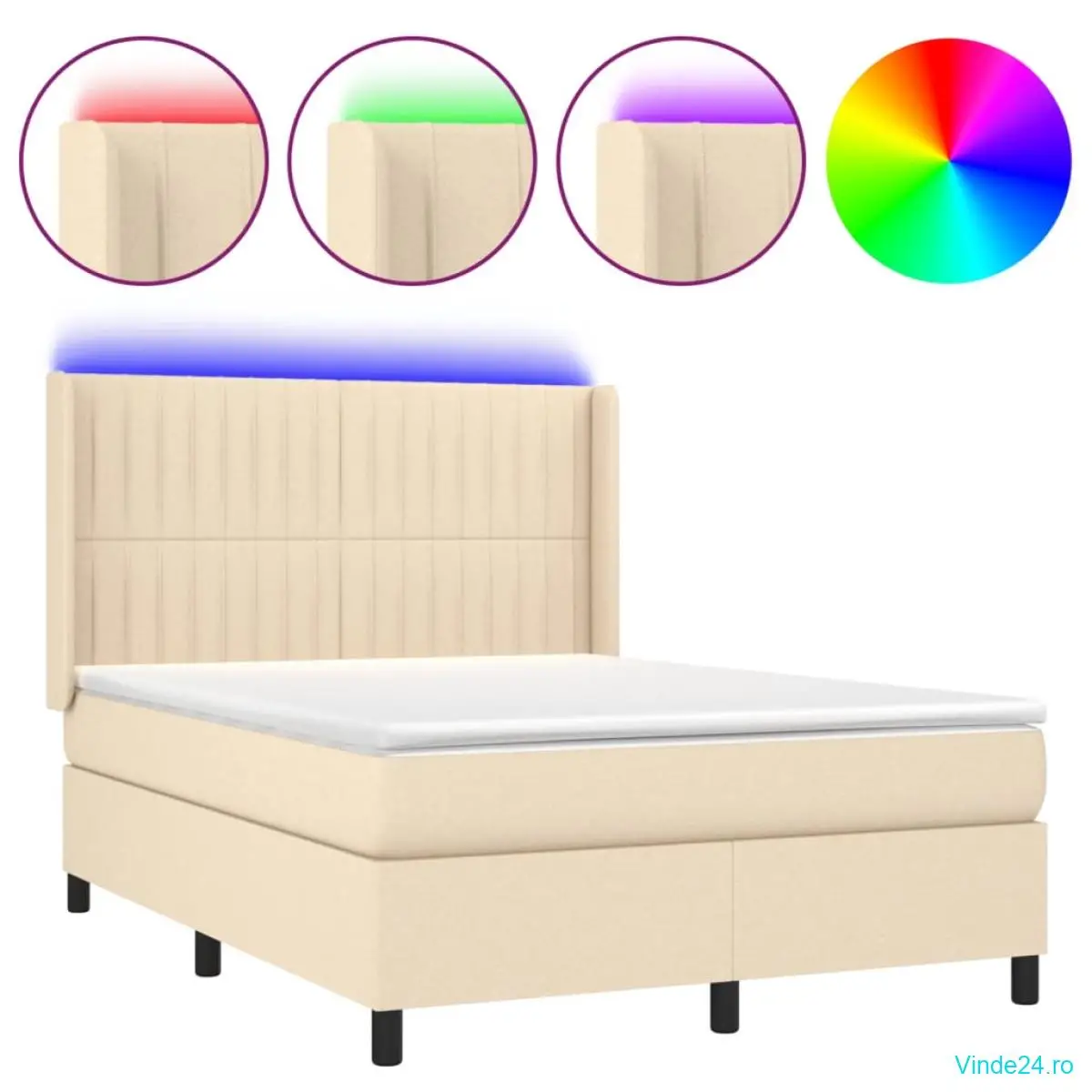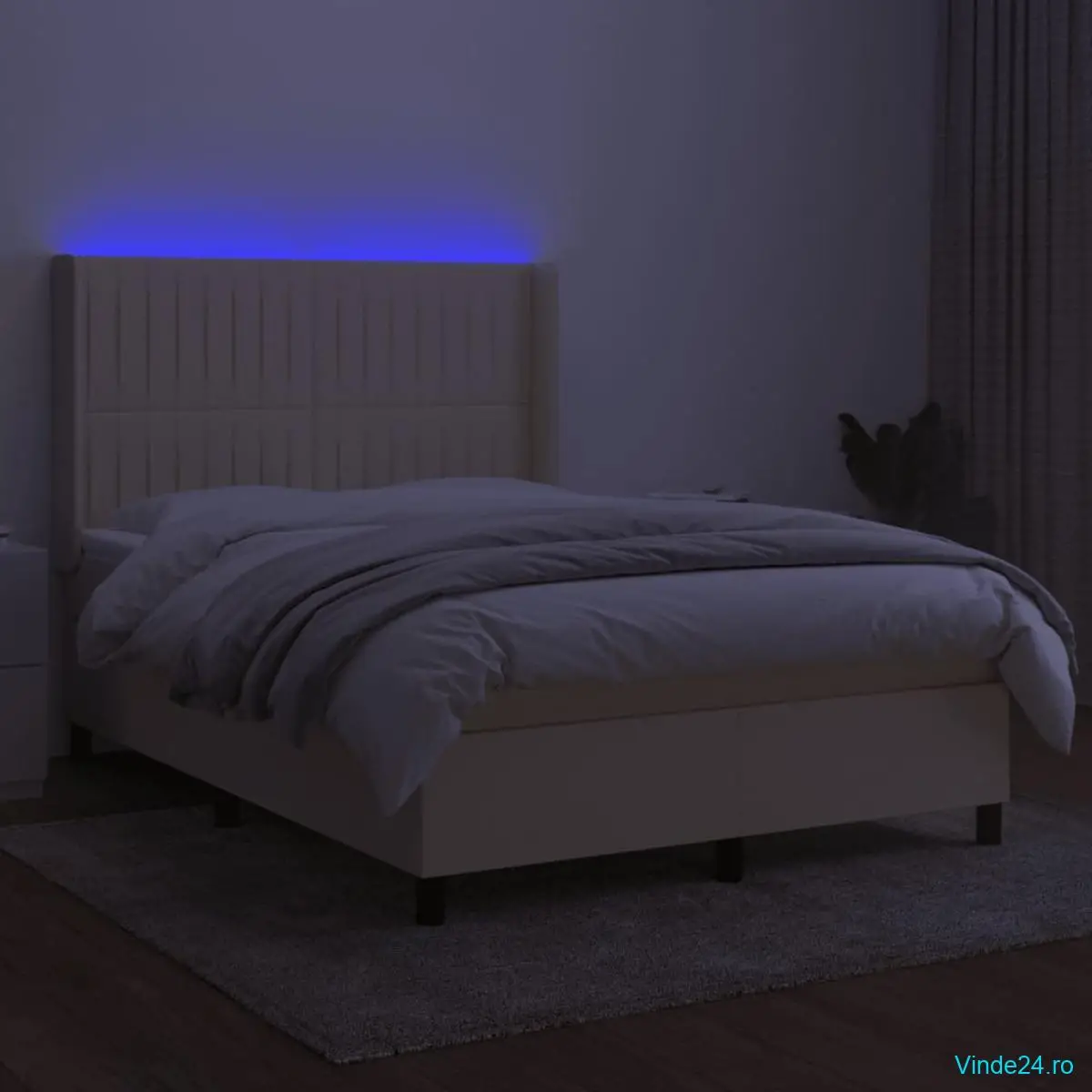 vidaXL Pat cu arcuri, saltea și LED, crem, 140x190 cm, textil