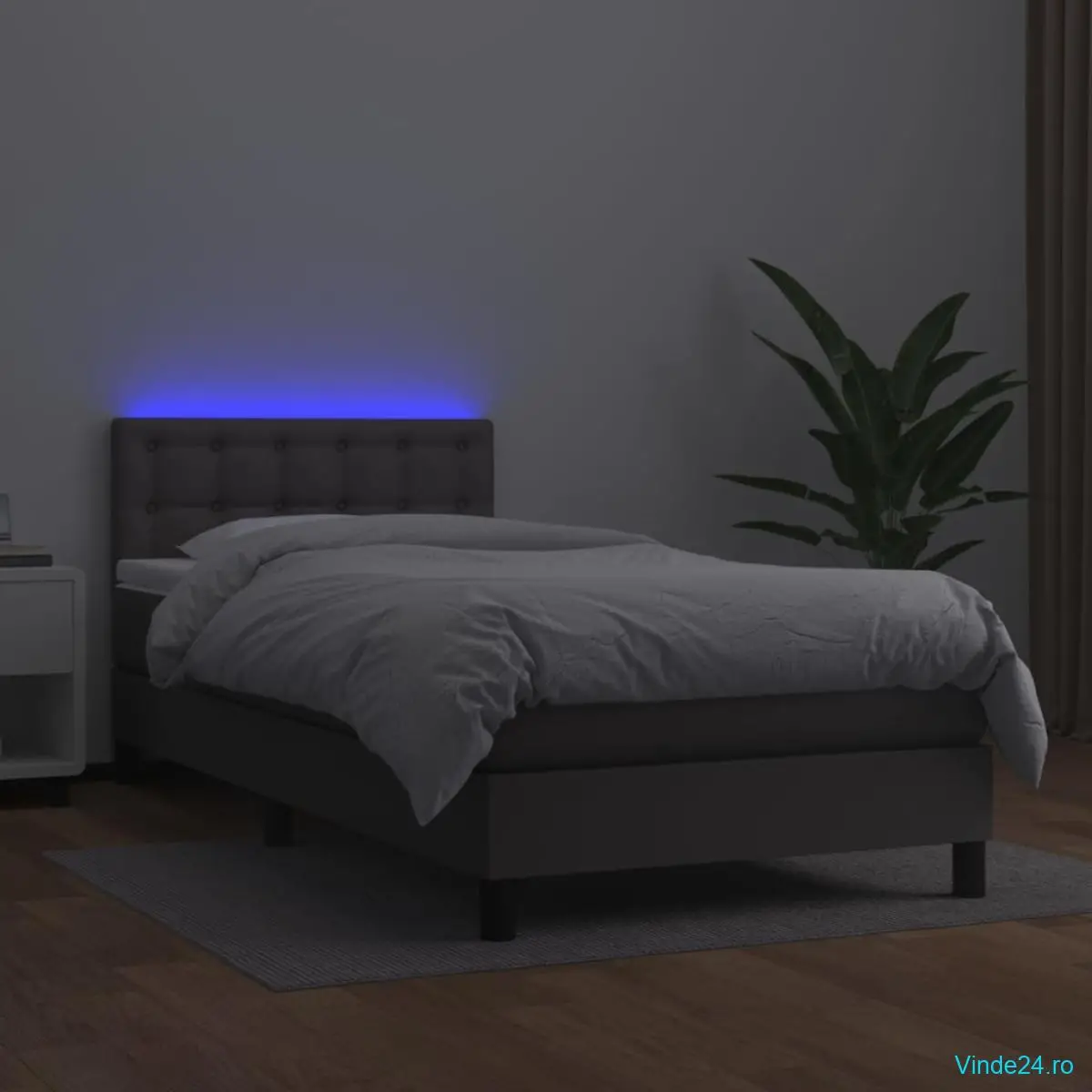 vidaXL Pat cu arcuri, saltea și LED, gri, 90x190 cm, piele ecologică