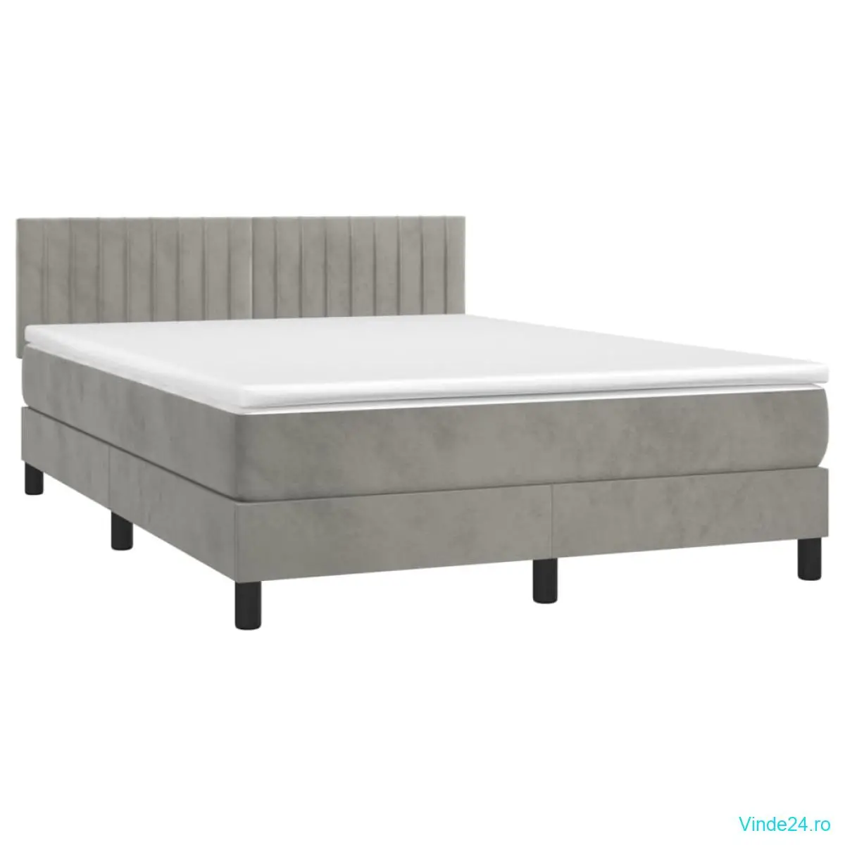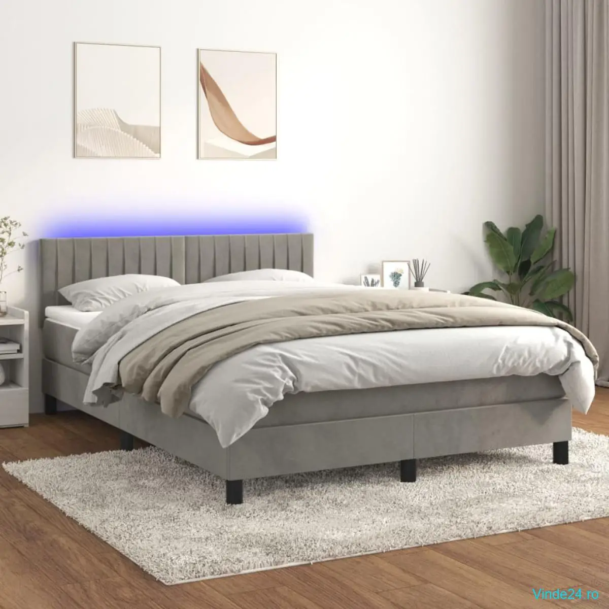 vidaXL Pat cu arcuri, saltea și LED, gri deschis, 140x200 cm, catifea