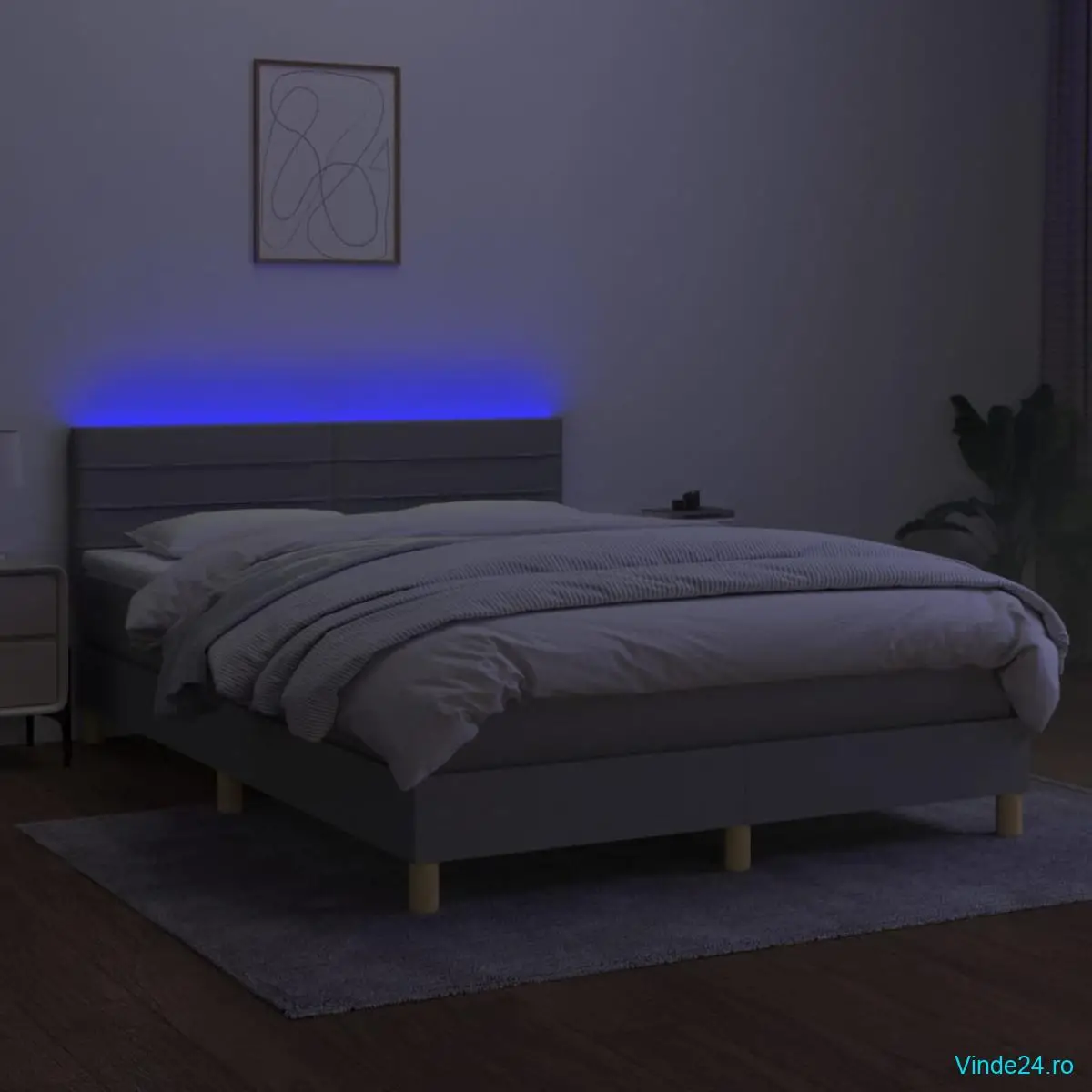 vidaXL Pat cu arcuri, saltea și LED, gri deschis, 140x200 cm, textil
