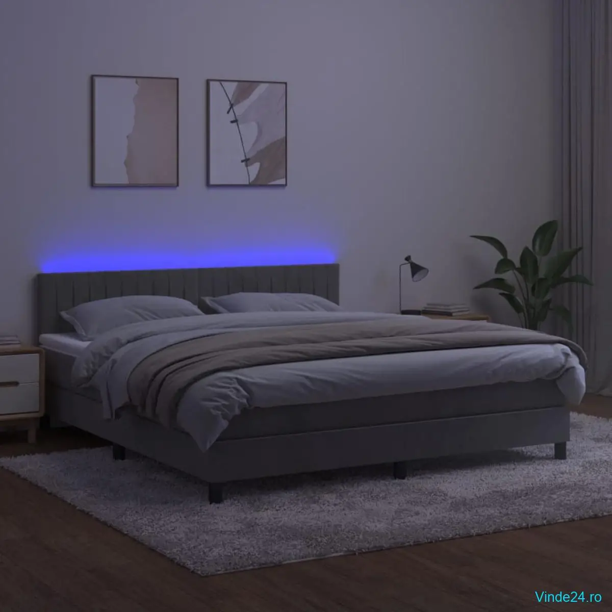 vidaXL Pat cu arcuri, saltea și LED, gri deschis, 160x200 cm, catifea