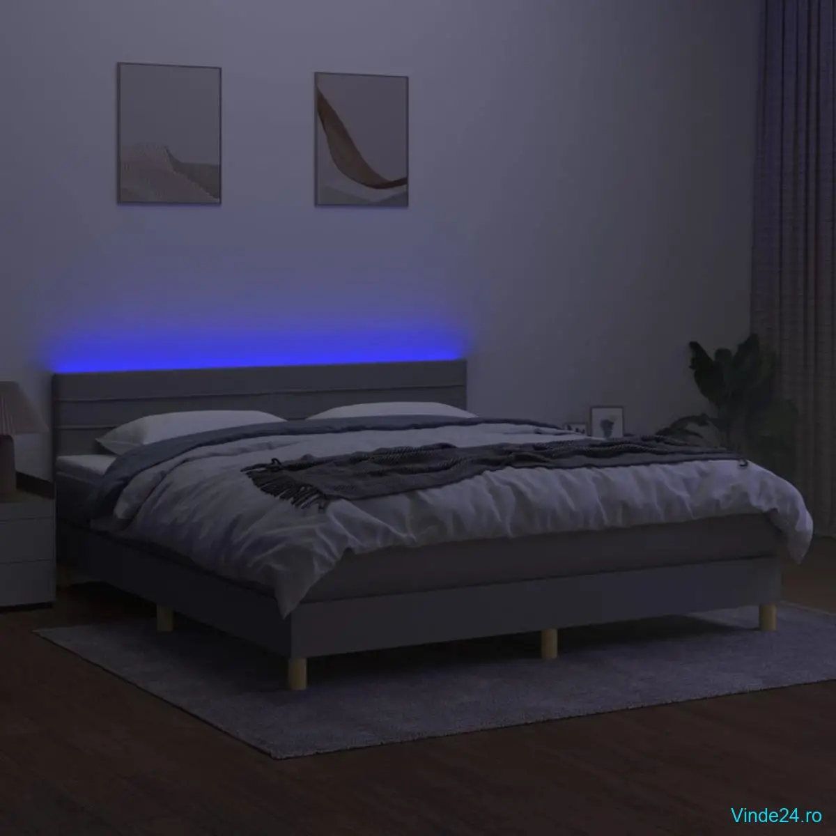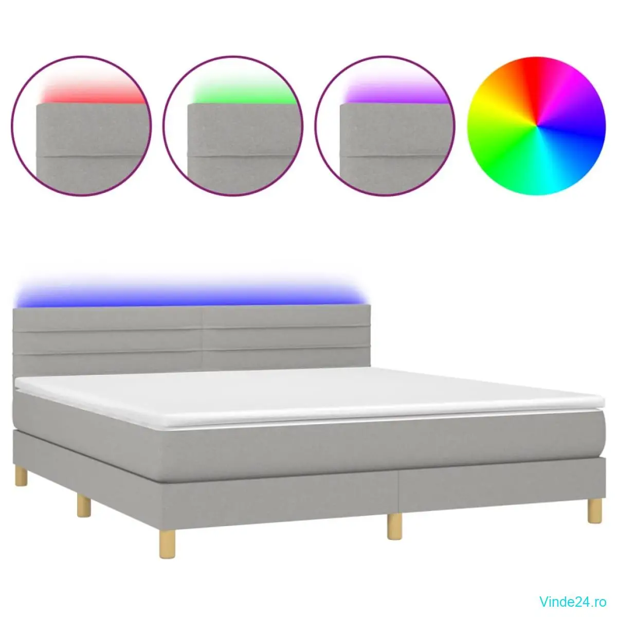 vidaXL Pat cu arcuri, saltea și LED, gri deschis, 180x200 cm, textil