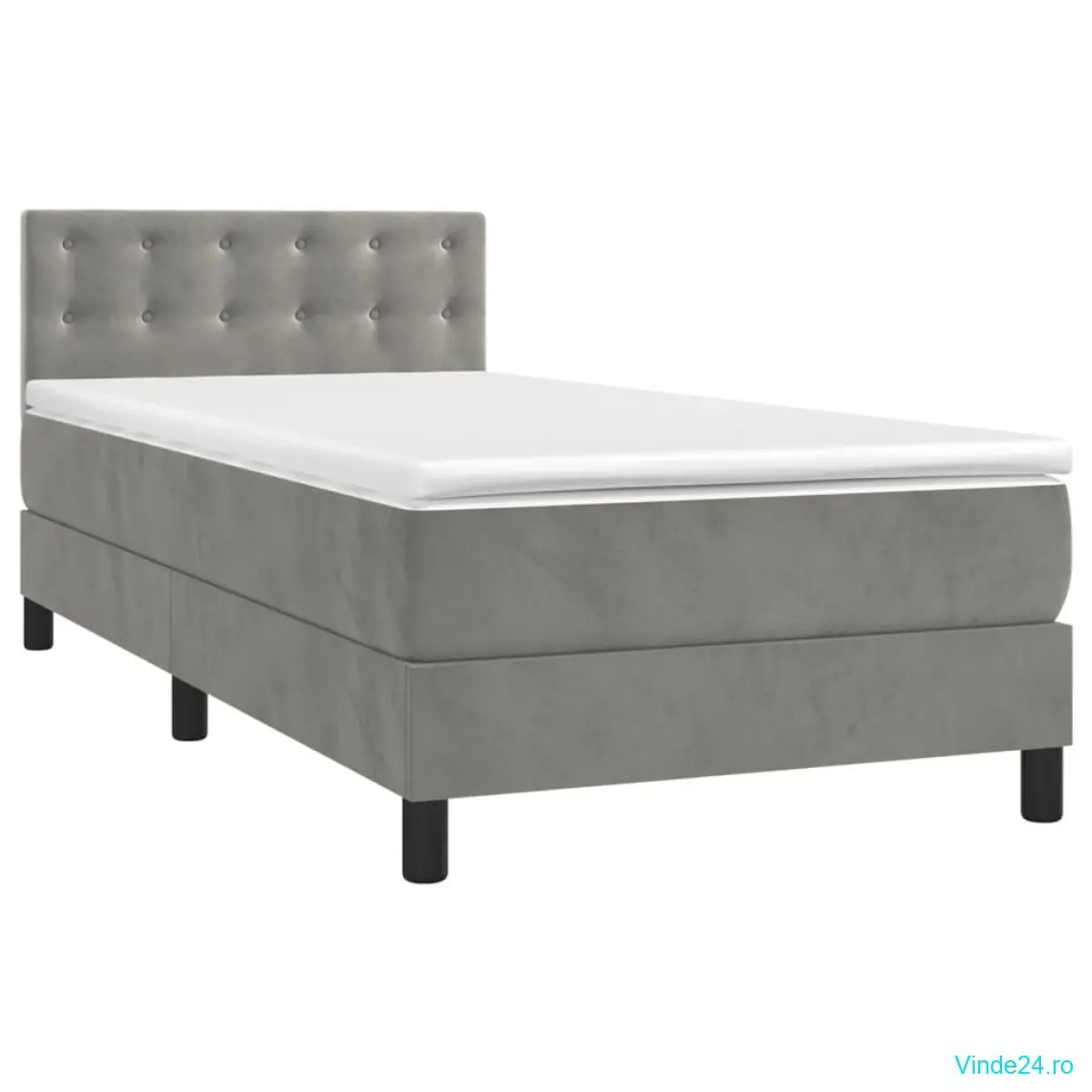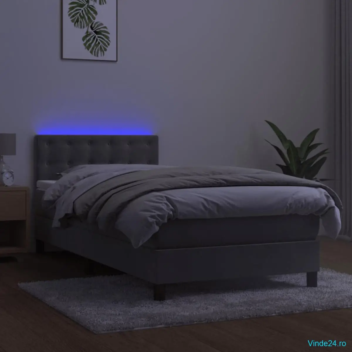 vidaXL Pat cu arcuri, saltea și LED, gri deschis, 90x200 cm, catifea