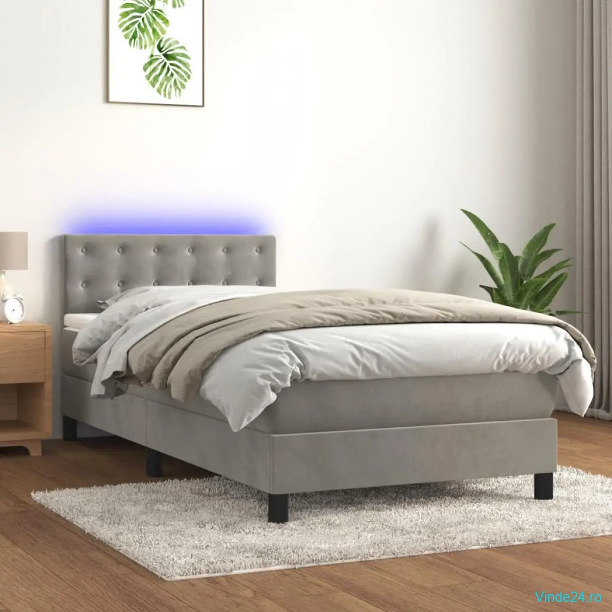 vidaXL Pat cu arcuri, saltea și LED, gri deschis, 90x200 cm, catifea