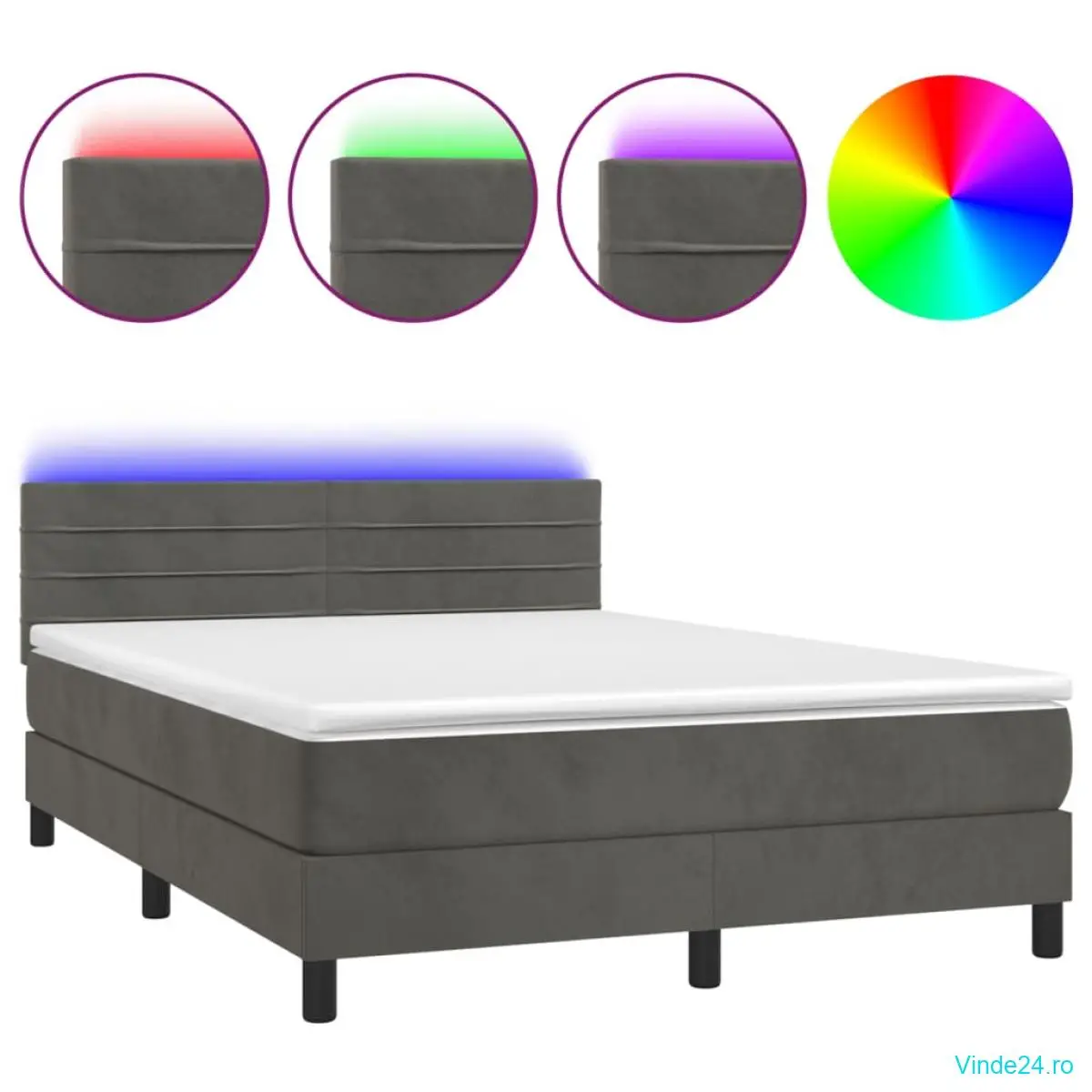 vidaXL Pat cu arcuri, saltea și LED, gri închis, 140x190 cm, catifea