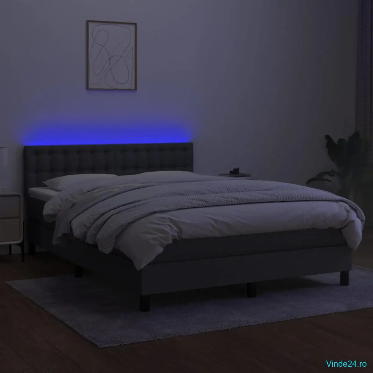 vidaXL Pat cu arcuri, saltea și LED, gri închis, 140x190 cm, textil