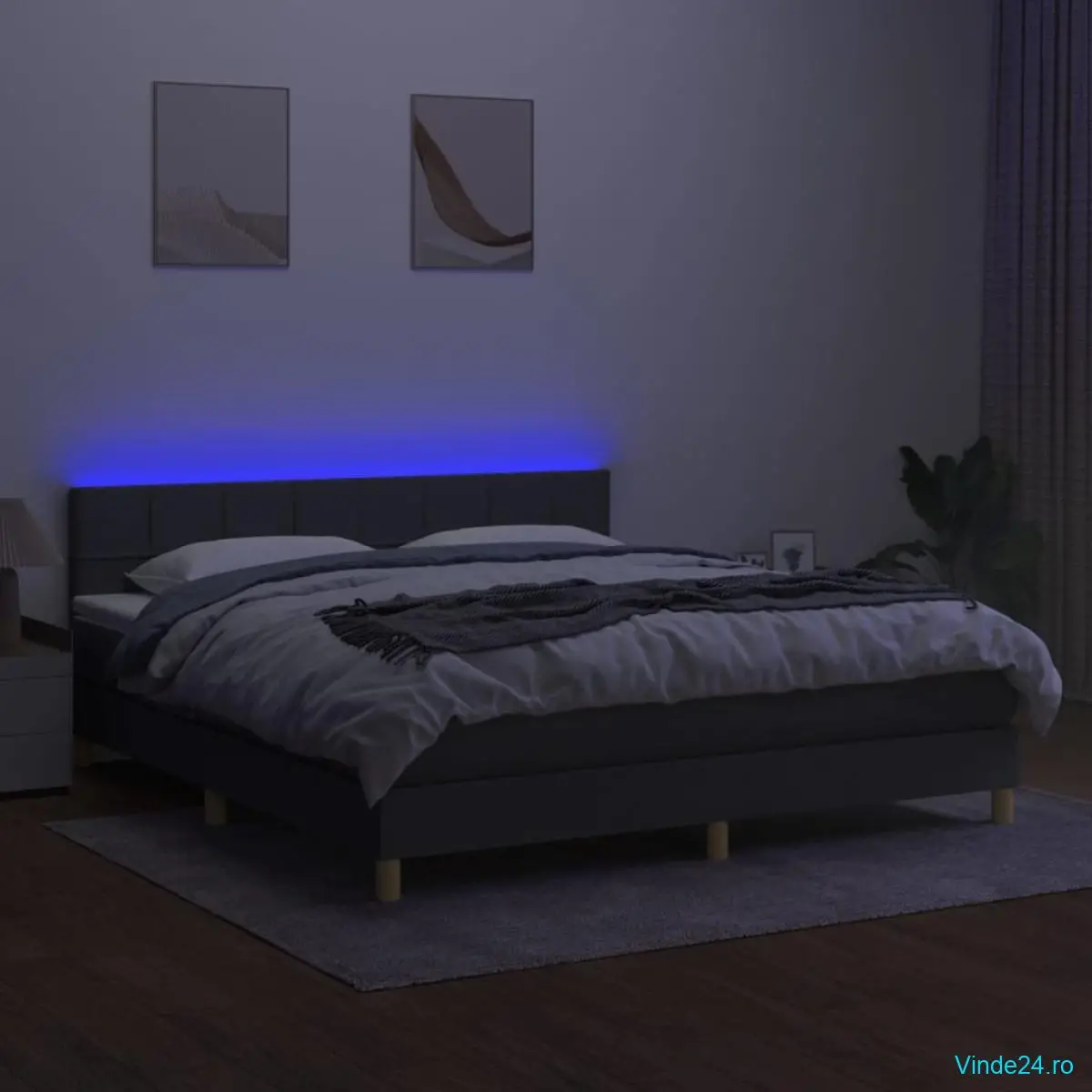vidaXL Pat cu arcuri, saltea și LED, gri închis, 180x200 cm, textil