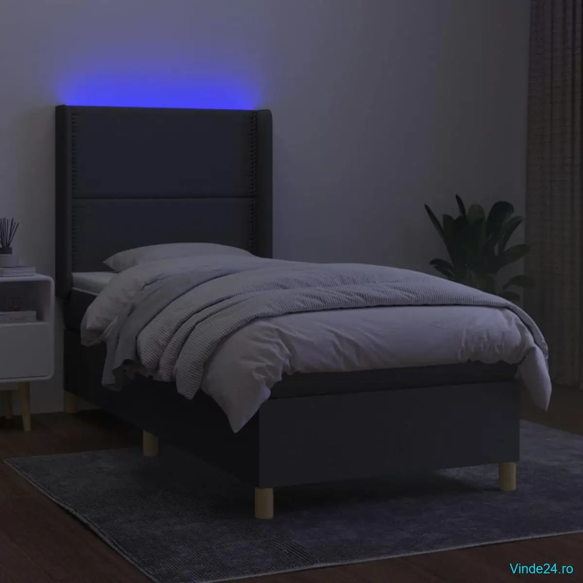 vidaXL Pat cu arcuri, saltea și LED, gri închis, 90x190 cm, textil