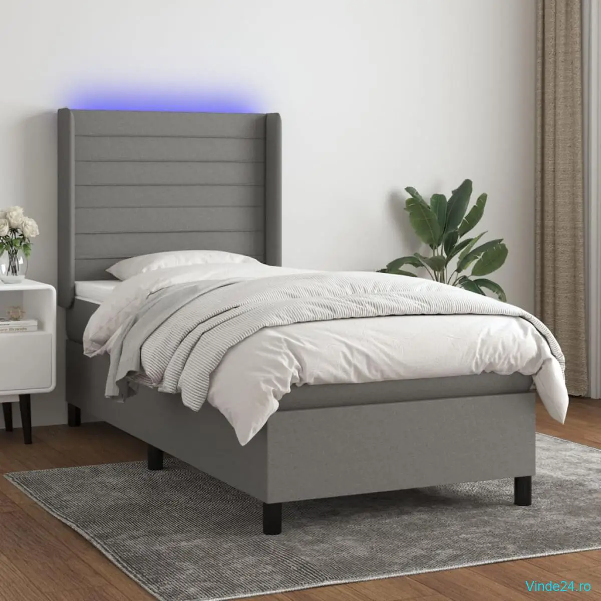 vidaXL Pat cu arcuri, saltea și LED, gri închis, 90x200 cm, textil