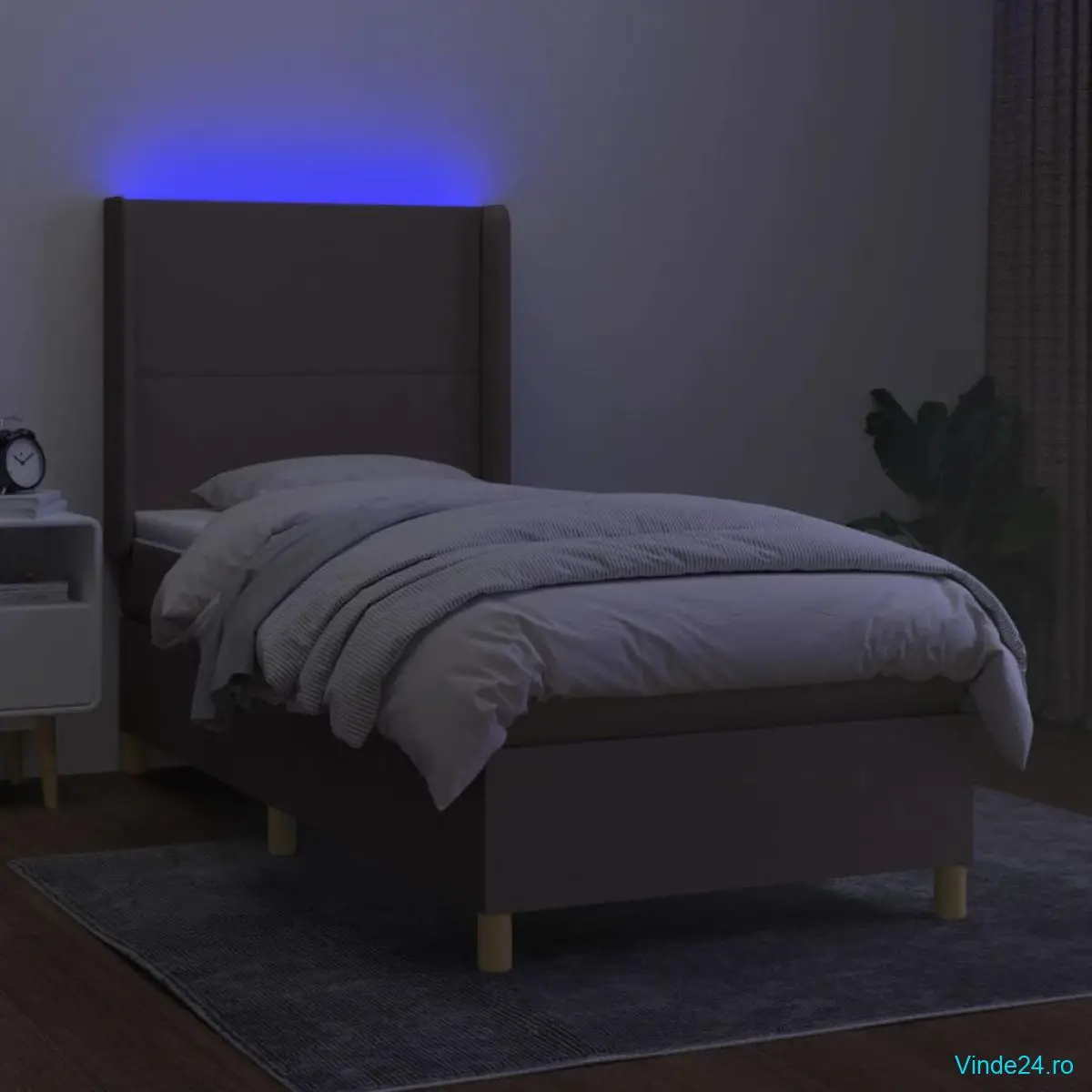 vidaXL Pat cu arcuri, saltea și LED, gri taupe, 90x200 cm, textil
