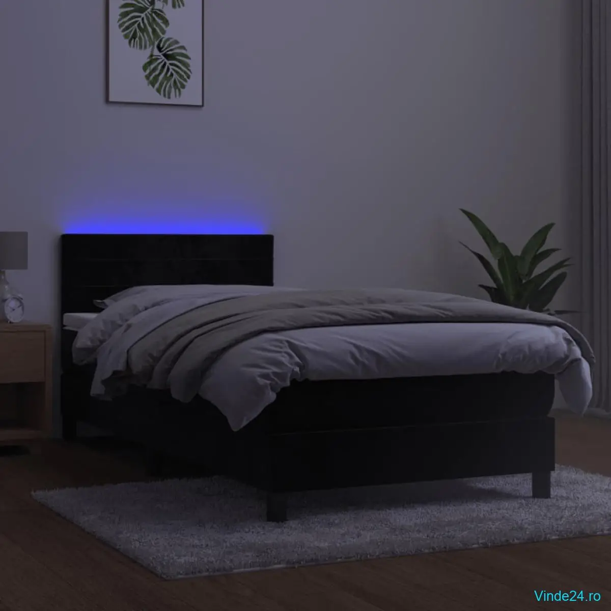 vidaXL Pat cu arcuri, saltea și LED, negru, 90x200 cm, catifea