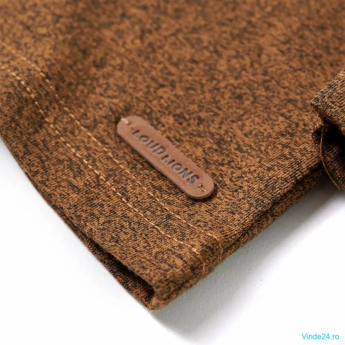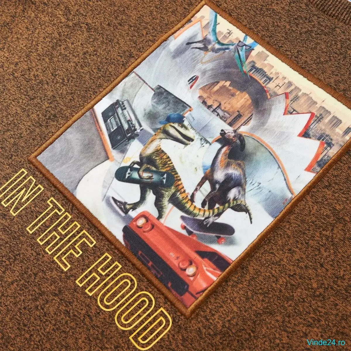 Acest tricou pentru copii are mâneci lungi, decolteu rotund și croială dreaptă. Acest tricou coniac melange prezintă dinozauri în oraș. Tricoul pentru copii cu mânecă lungă este confecționat din 50% bumbac și 50% poliester care este tratat cu silicon și spălare cu enzime, pentru o atingere moale și confortabilă.