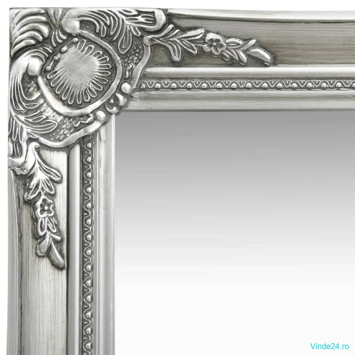 Această oglindă în stil antichizat are o ramă solidă din lemn și a fost lucrată cu măiestrie cu un model decorativ în stil baroc. În plus, marginea tăiată oblic conferă acestei oglinzi un aspect unic.