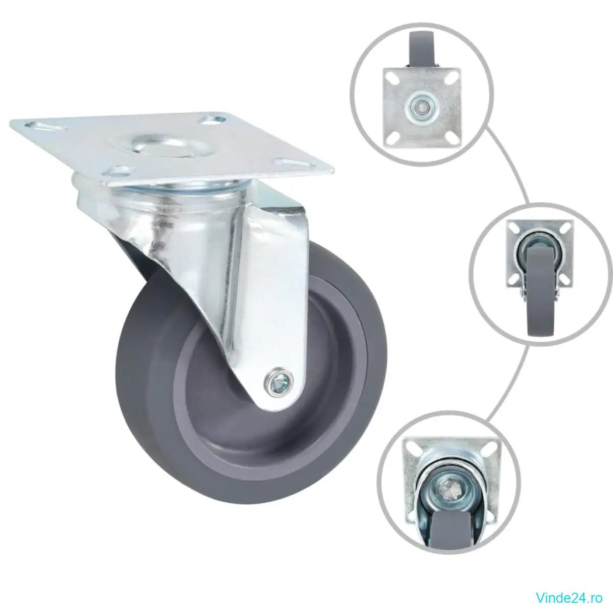 Aceste roți sunt fabricate din TPR (cauciuc termoplastic) care se remarcă printr-o bună rezistență la șocuri și vibrații, permițând roților să funcționeze lin și silențios. În plus, suprafețele lor moi protejează eficient podeaua împotriva zgârieturilor. Cadrul din fier zincat este foarte rezistent la rugină și adaugă un plus de robustețe și durabilitate roților. Fiecare roată poate suporta o greutate maximă de până la 45 kg.
