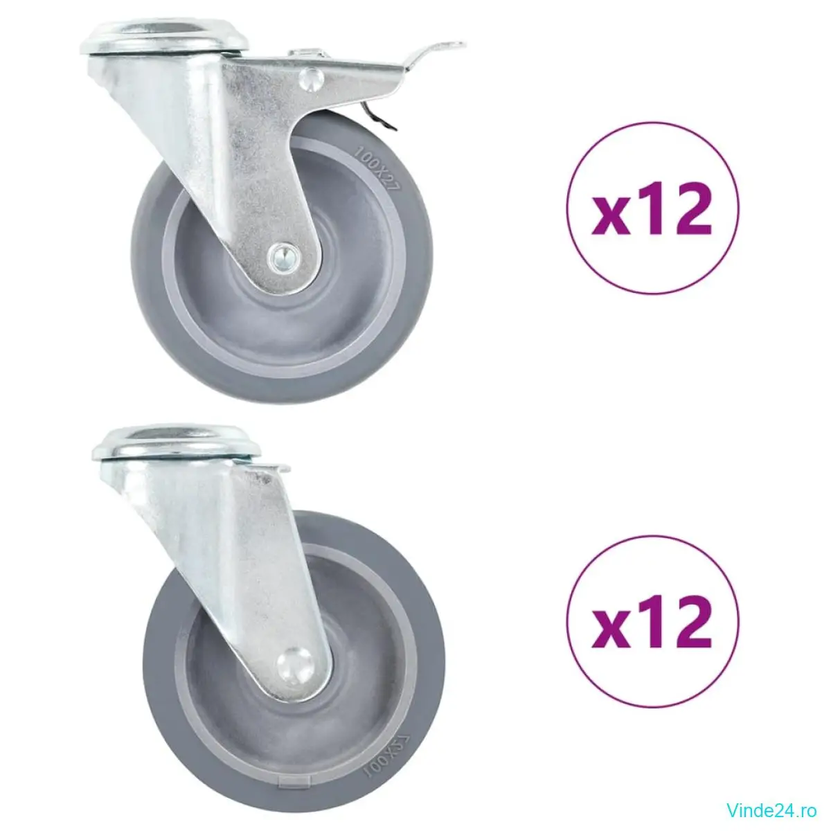 Pachetul de livrare include 12 roți pivotante cu gaură pentru șurub și 12 roți pivotante cu gaură pentru șurub și cu frâne.
