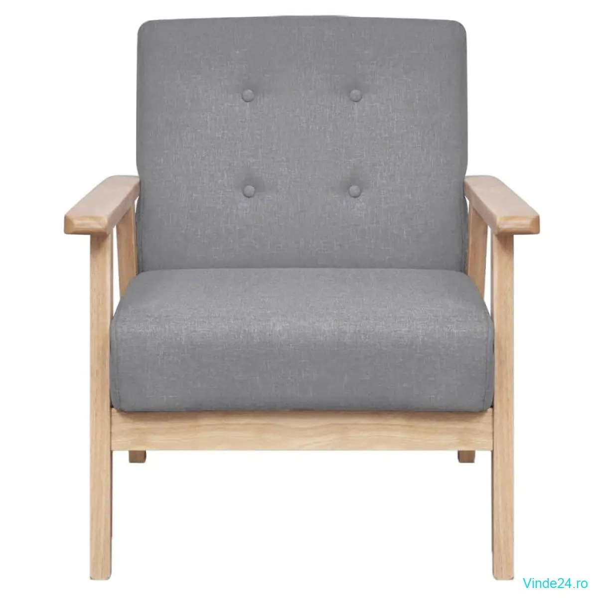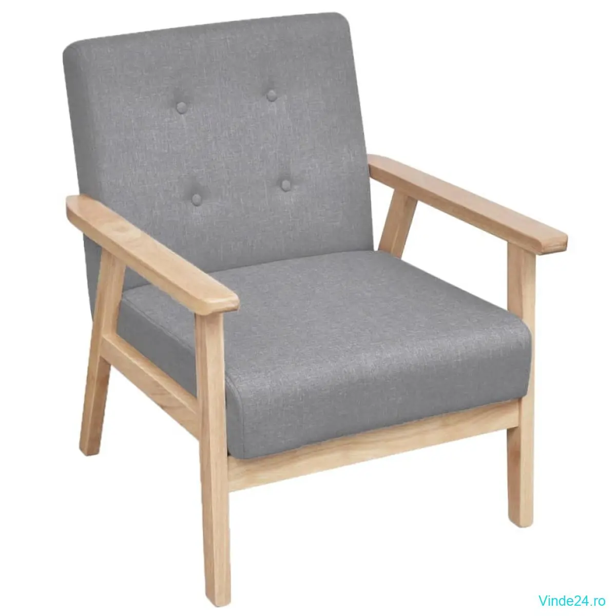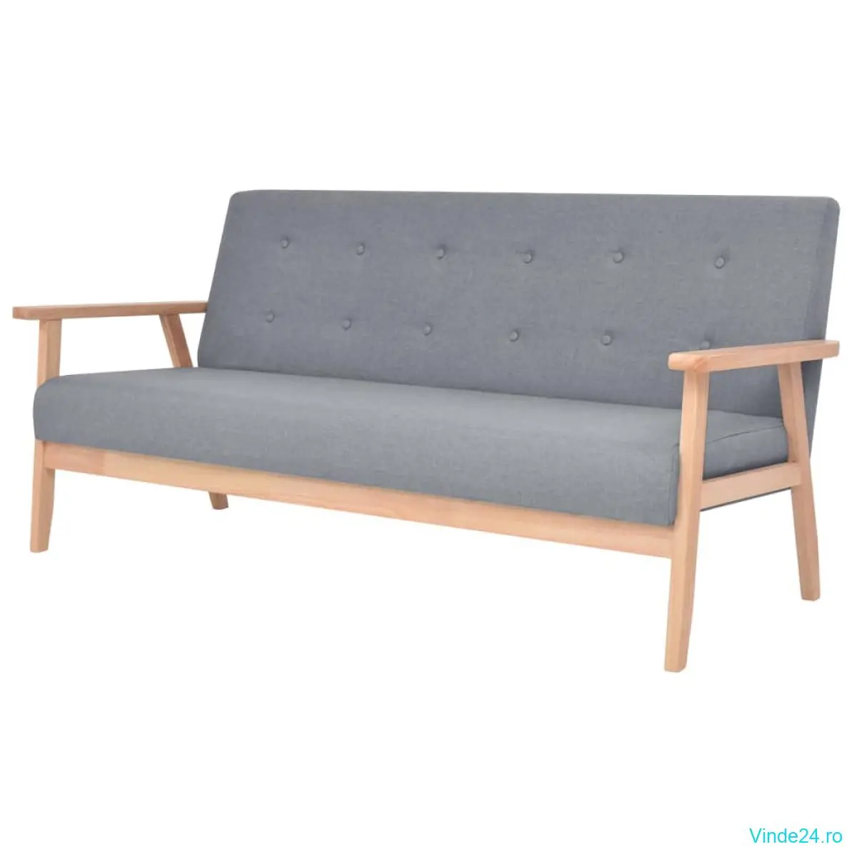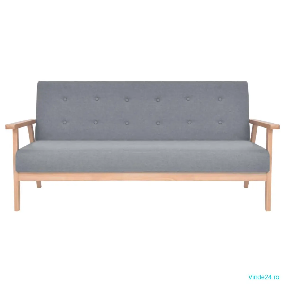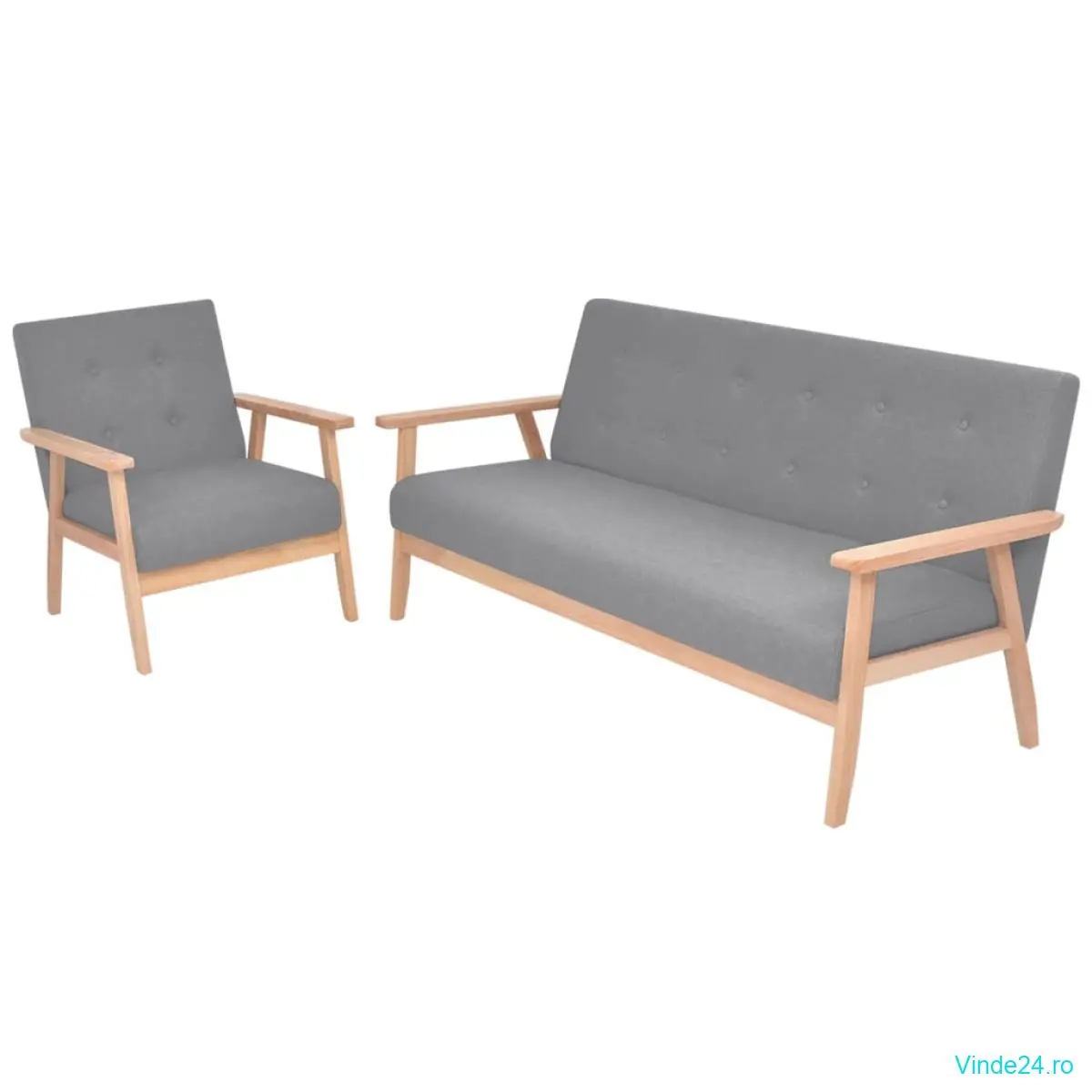 Setul de canapele este tapițat cu țesătură din poliester, moale și căptușită cu spumă, pentru un confort sporit. Având un cadru rezistent din lemn, setul de canapele este stabil și durabil. De asemenea, este ușor de asamblat.