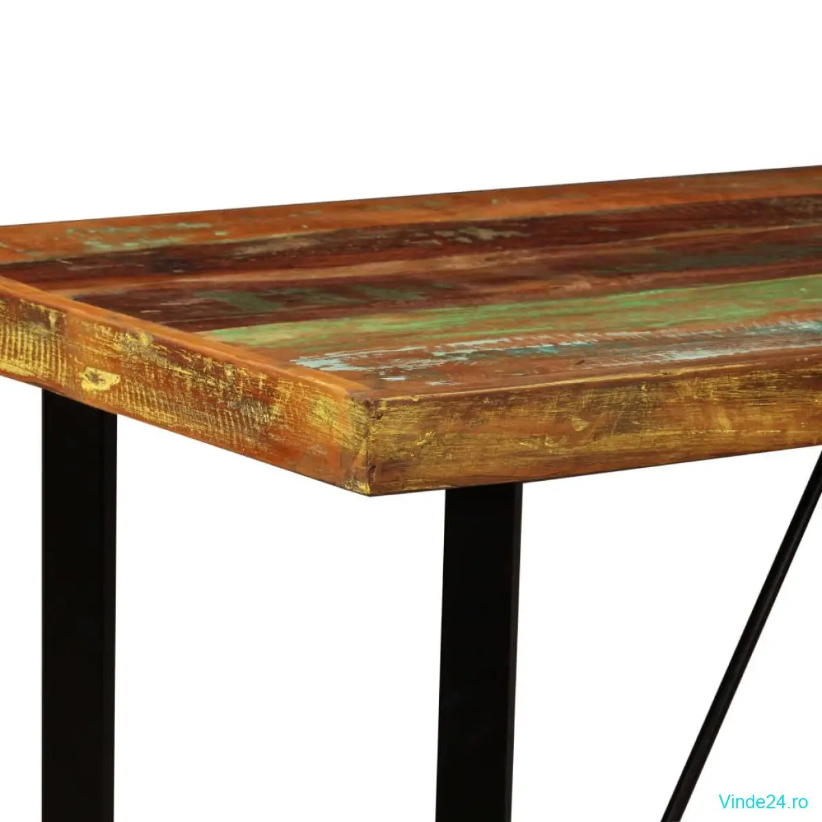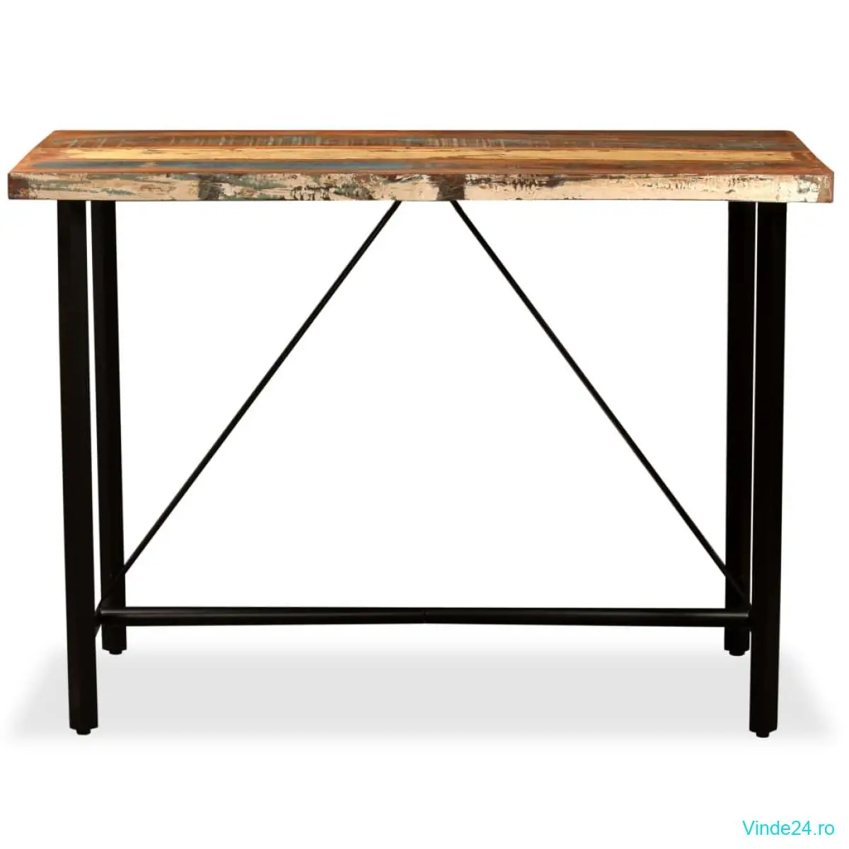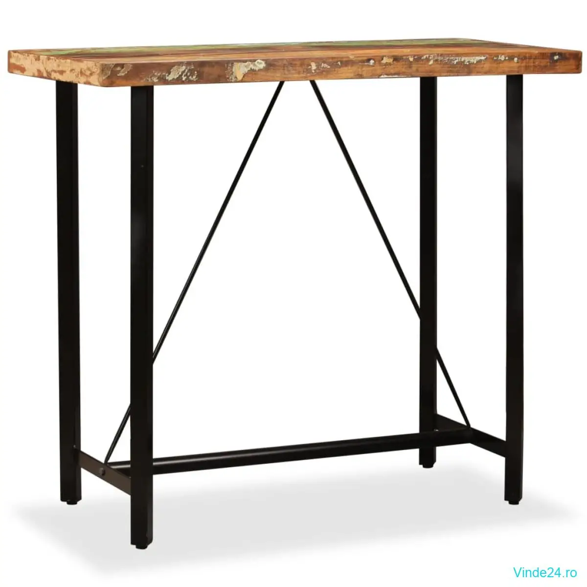 Masa de bar este fabricată din lemn masiv reciclat, care păstrează caracteristicile unor tipuri diferite de lemn, precum tec, mango, acacia etc. Lemnul reciclat este solid, stabil, durabil și frumos. Semnele de uzură și măiestria execuției oferă un aspect unic fiecărei piese. Este realizat complet manual. Picioarele puternice din oțel oferă robustețe și durabilitate mesei, îmbogățind stilul său industrial spectaculos. Notă importantă: Granulația și culorile lemnului pot varia de la o piesă la alta, fiecare piesă de mobilier fiind unică; livrarea este aleatorie.