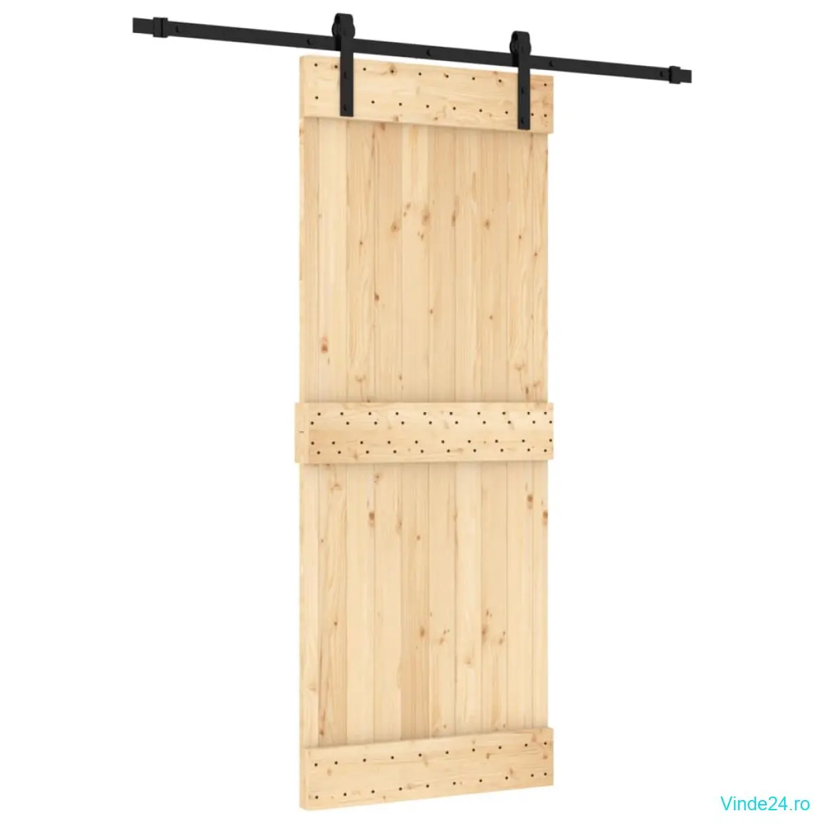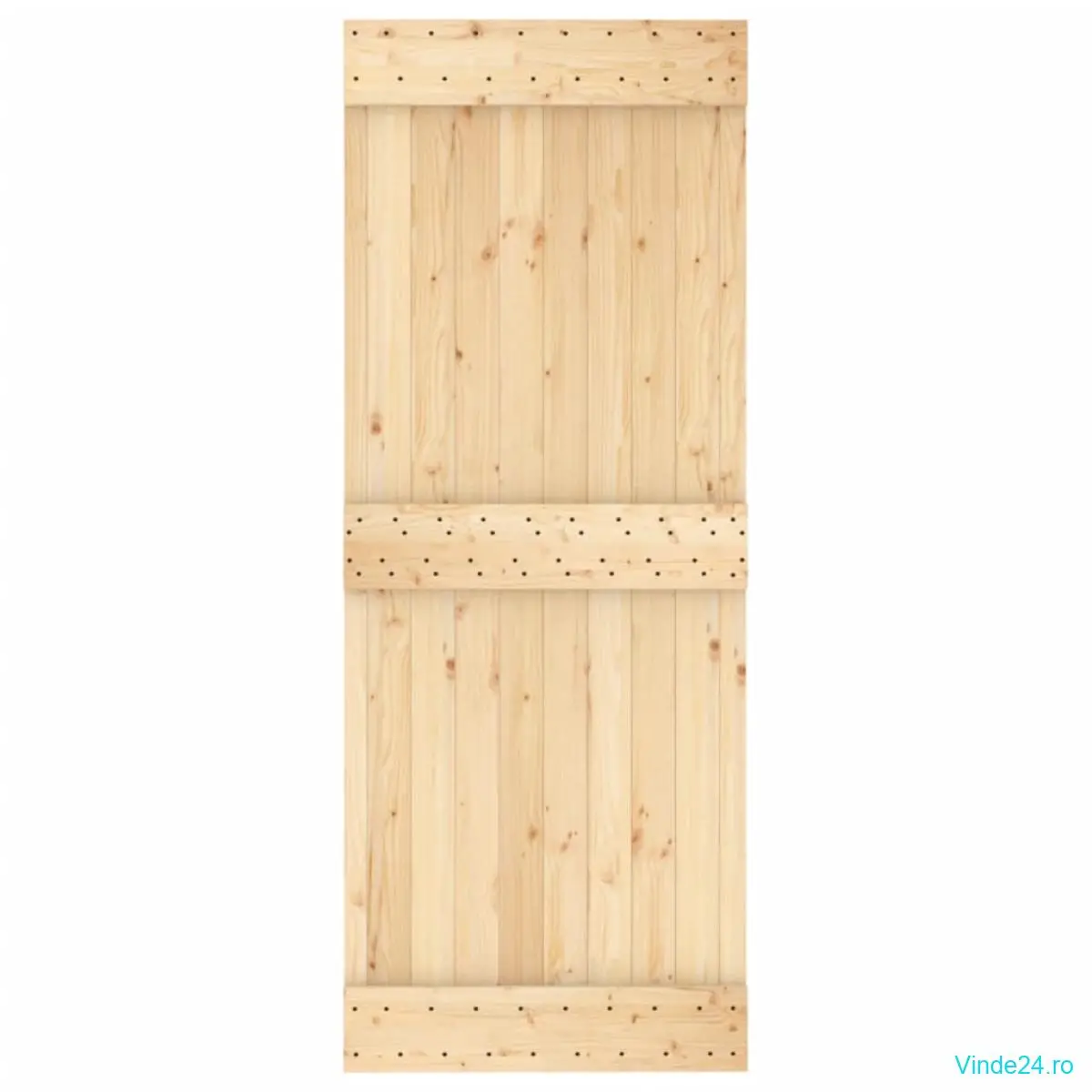 - Lemn masiv de pin: Această ușă de interior este realizată din lemn masiv de pin. Lemnul masiv de pin este un material natural frumos. Lemnul de pin are o granulație plană, iar nodurile conferă materialului unicitate și un aspect rustic.