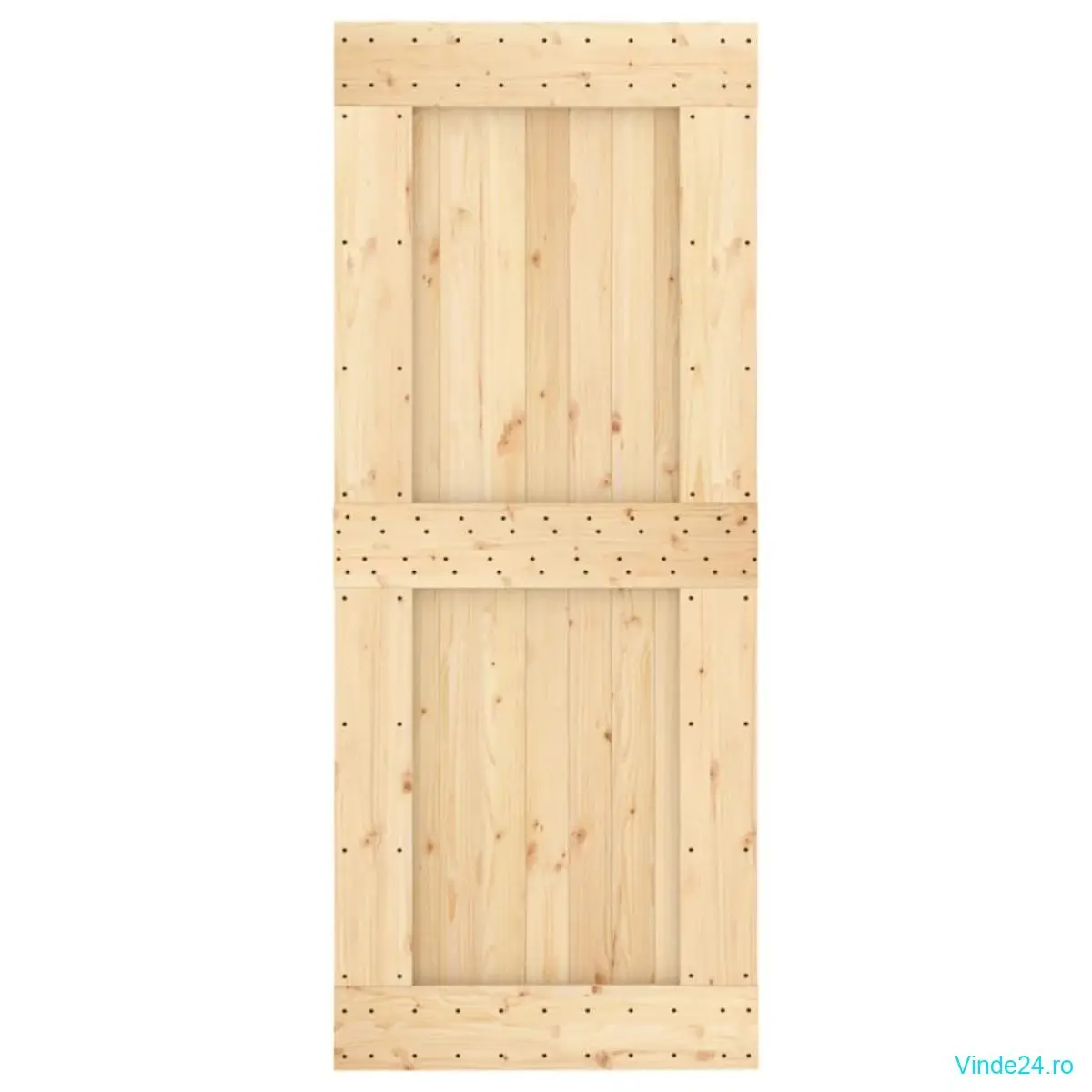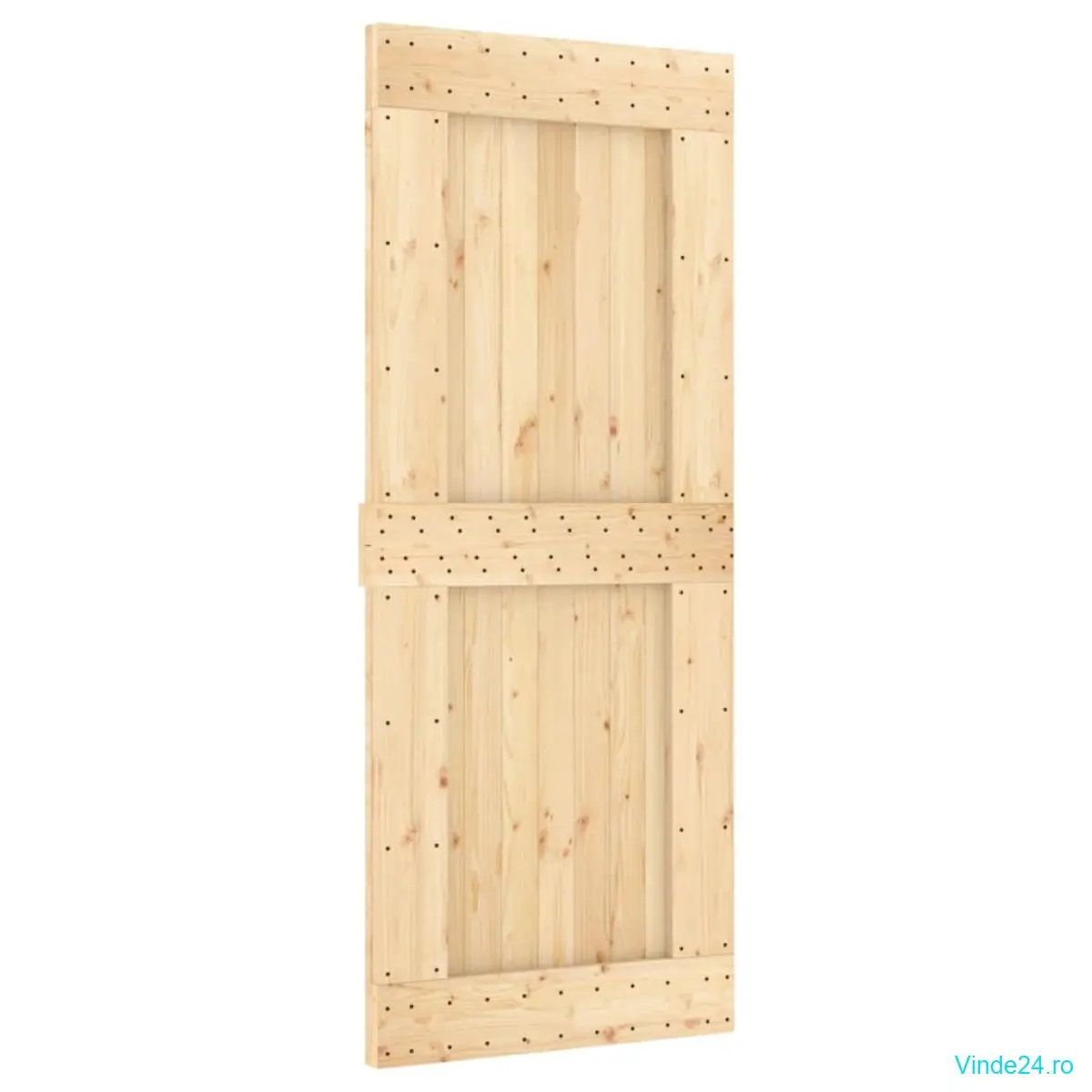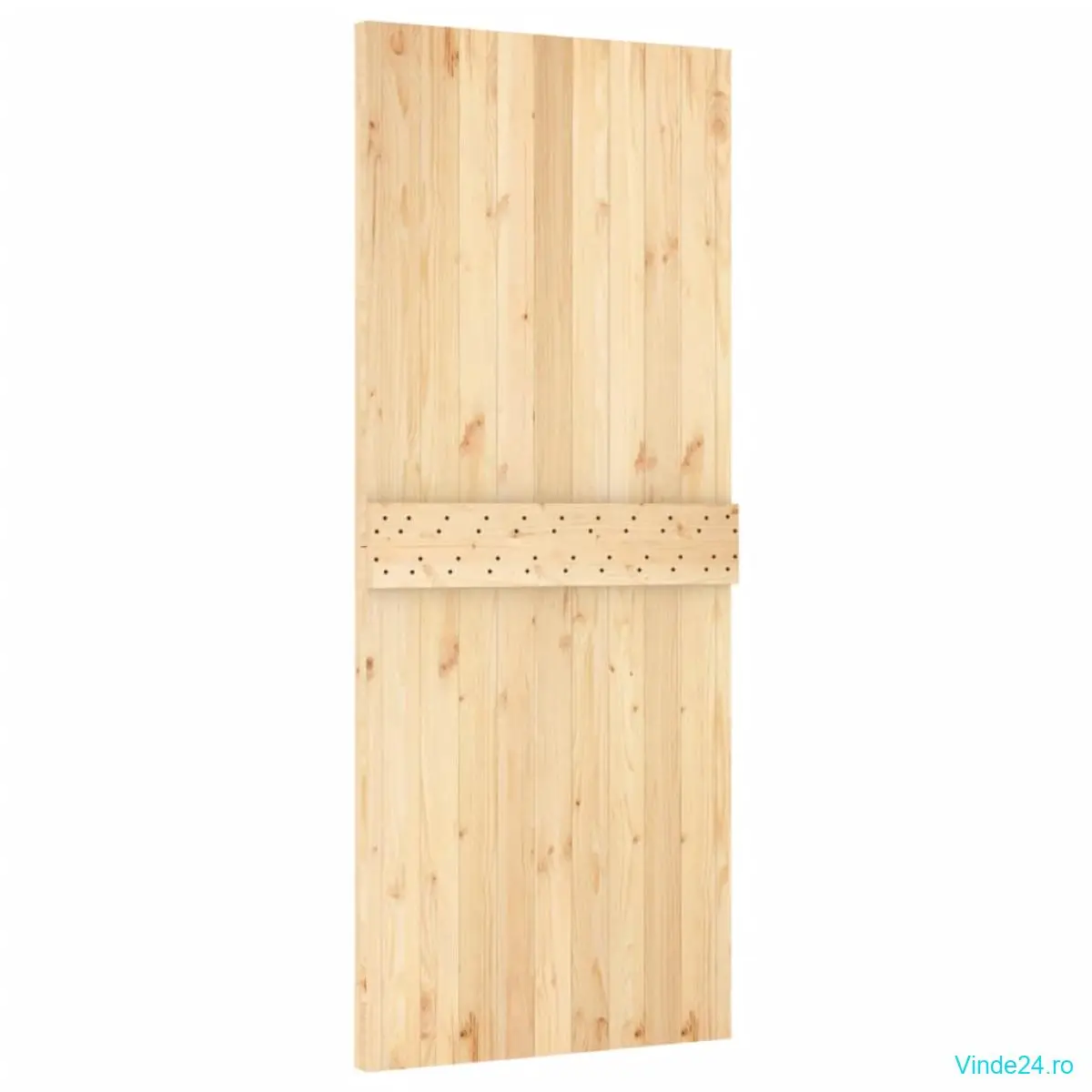 - Lemn masiv de pin: Această ușă de interior este realizată din lemn masiv de pin. Lemnul masiv de pin este un material natural frumos. Lemnul de pin are o granulație plană, iar nodurile conferă materialului unicitate și un aspect rustic.