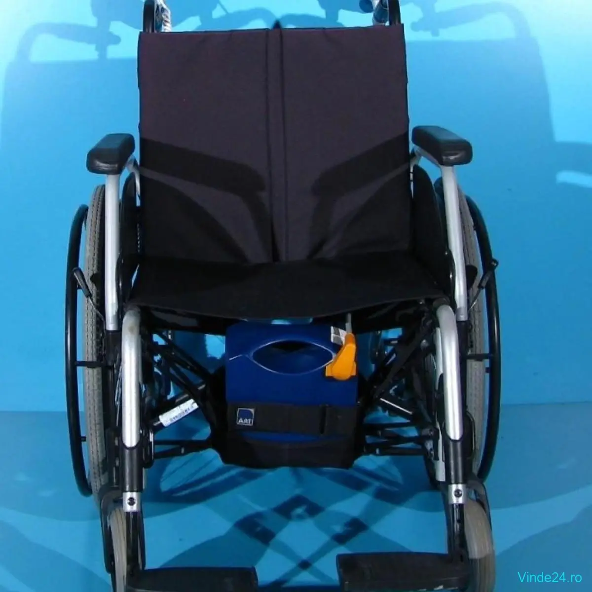 Scaunul handicap dispune de lateralele rabatabile sus/jos, centura de siguranta, si rotite antirasturnare.