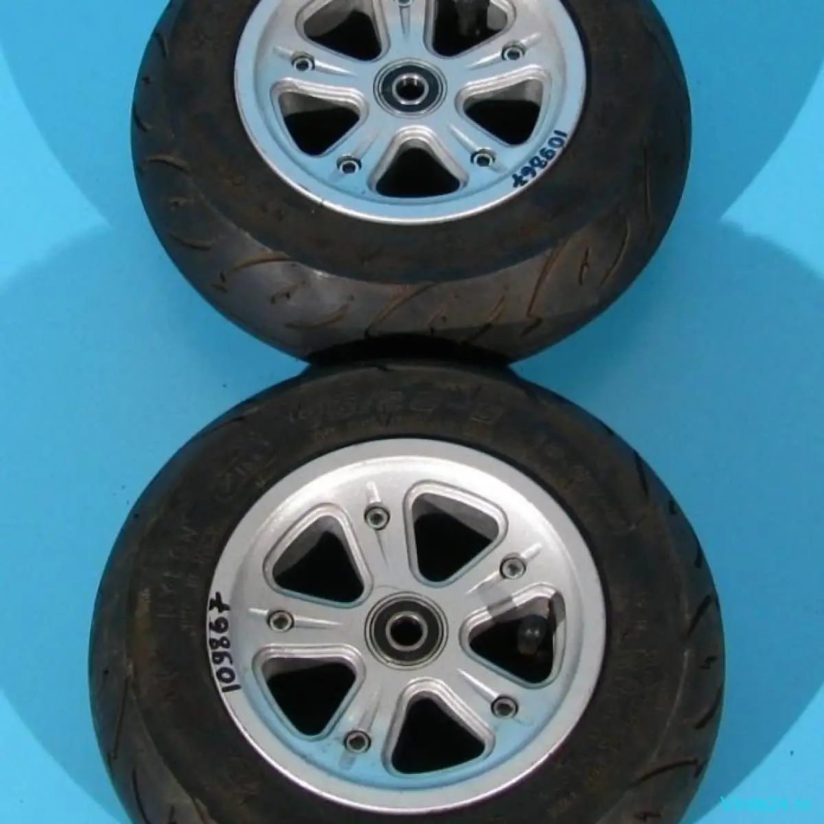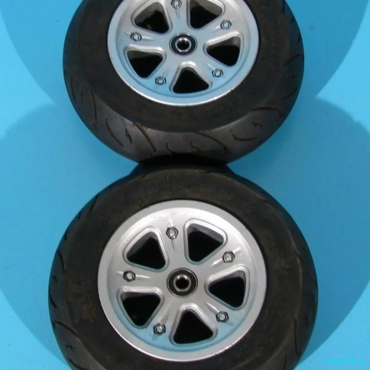 Jantele din aluminiu, din 2 bucati, cu prindere in 5 suruburi,  permit inlocuirea cauciucurilor si cu unele pline (fara camera).