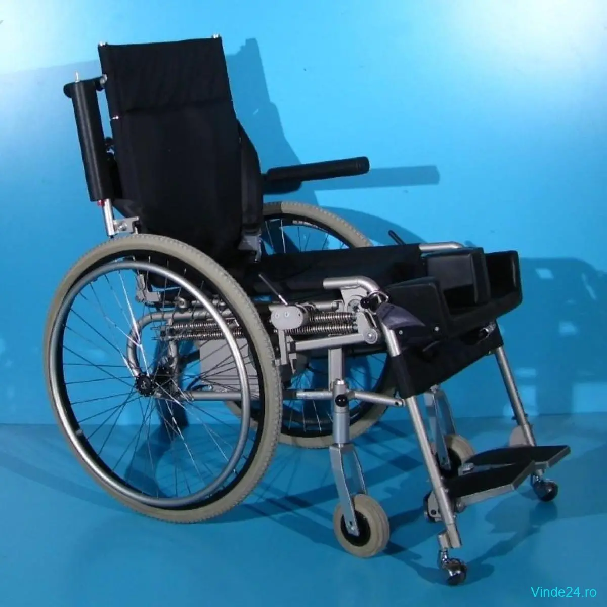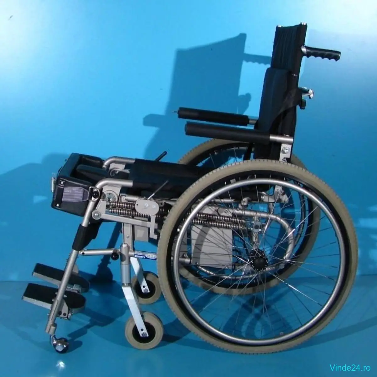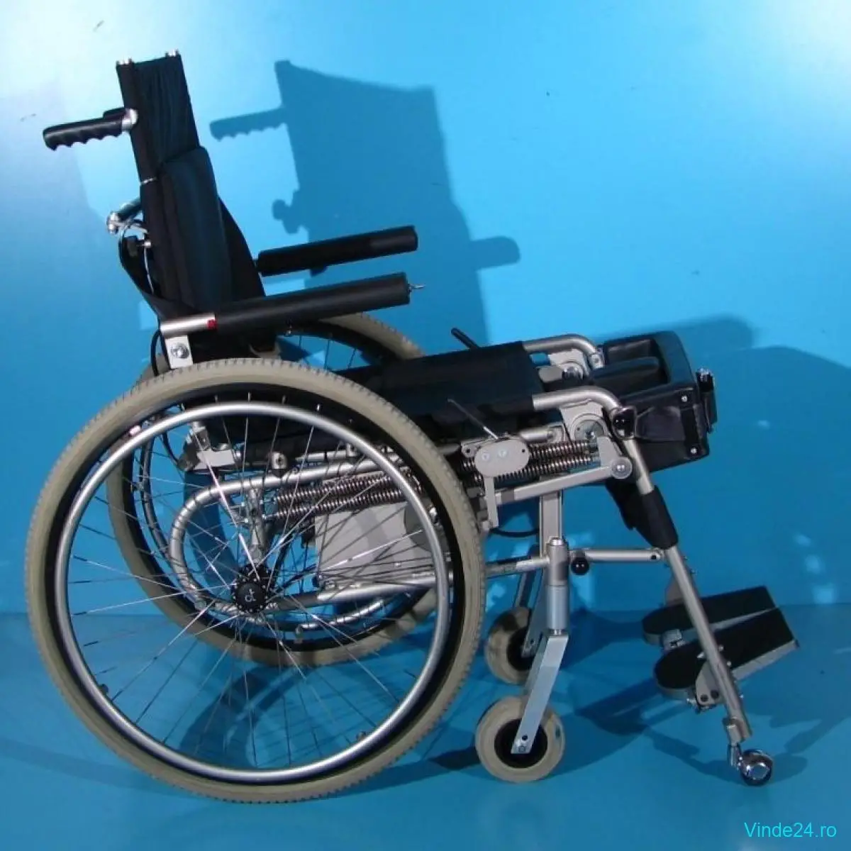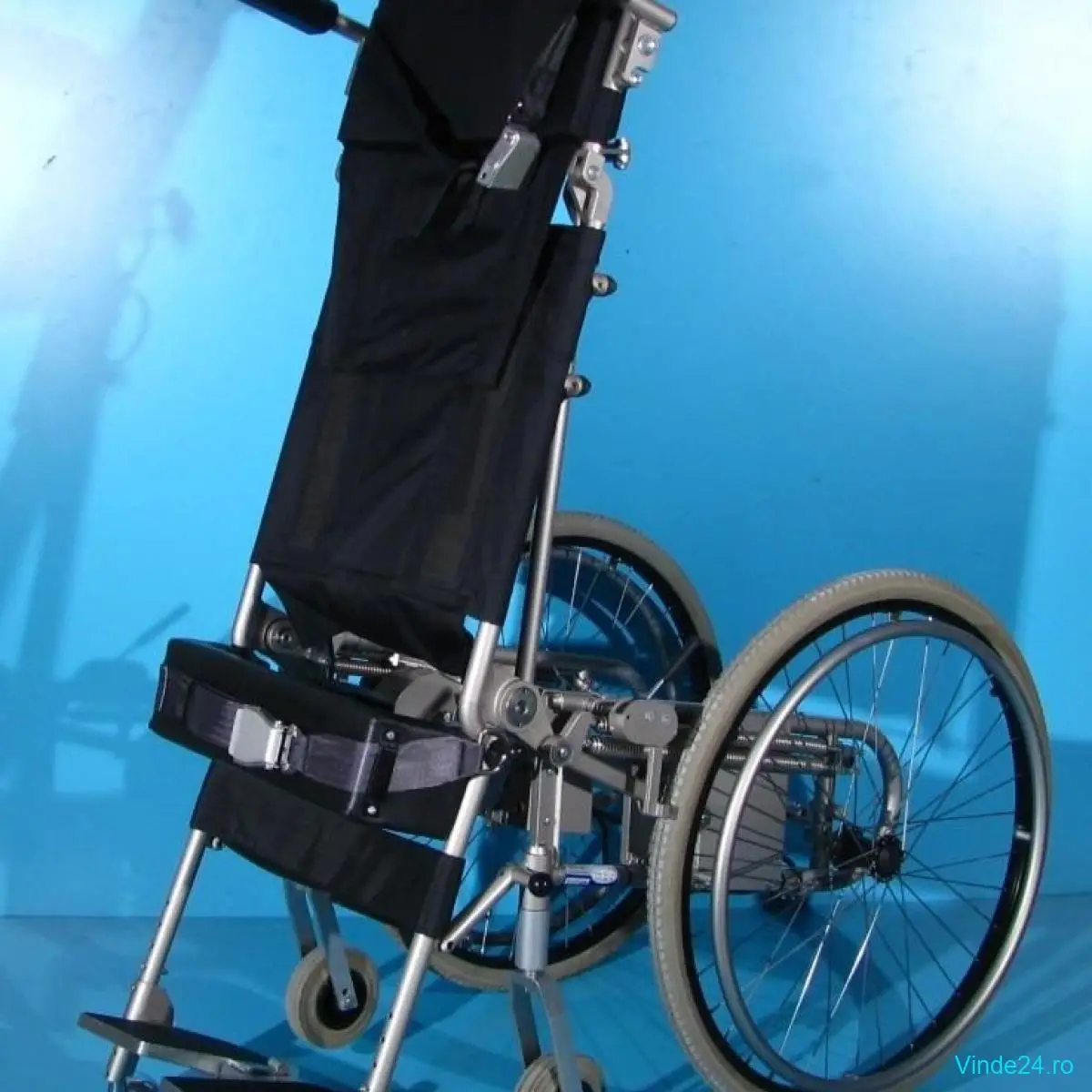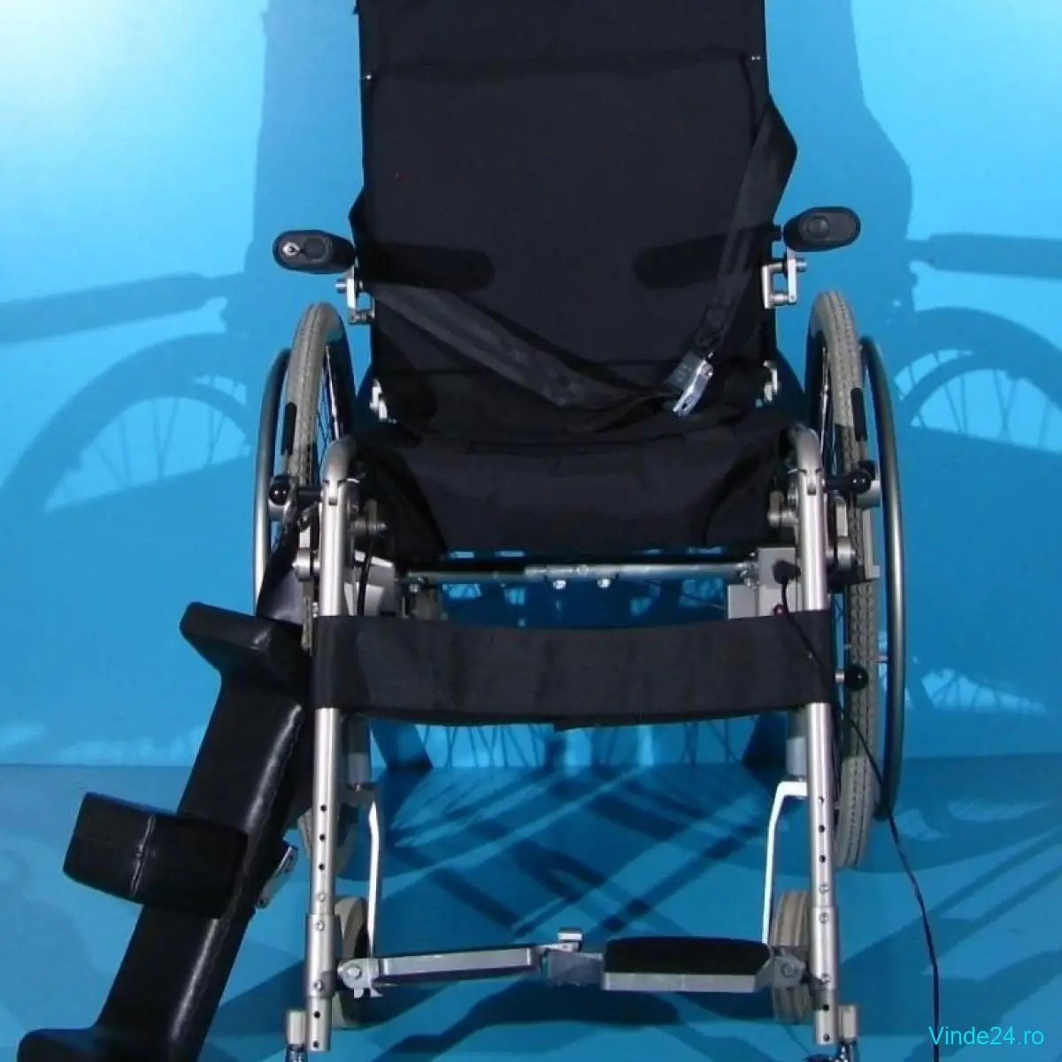 Scaun cu rotile pliabil cu verticalizare electrica second-hand destinat persoanelor cu afectiuni locomotorii.