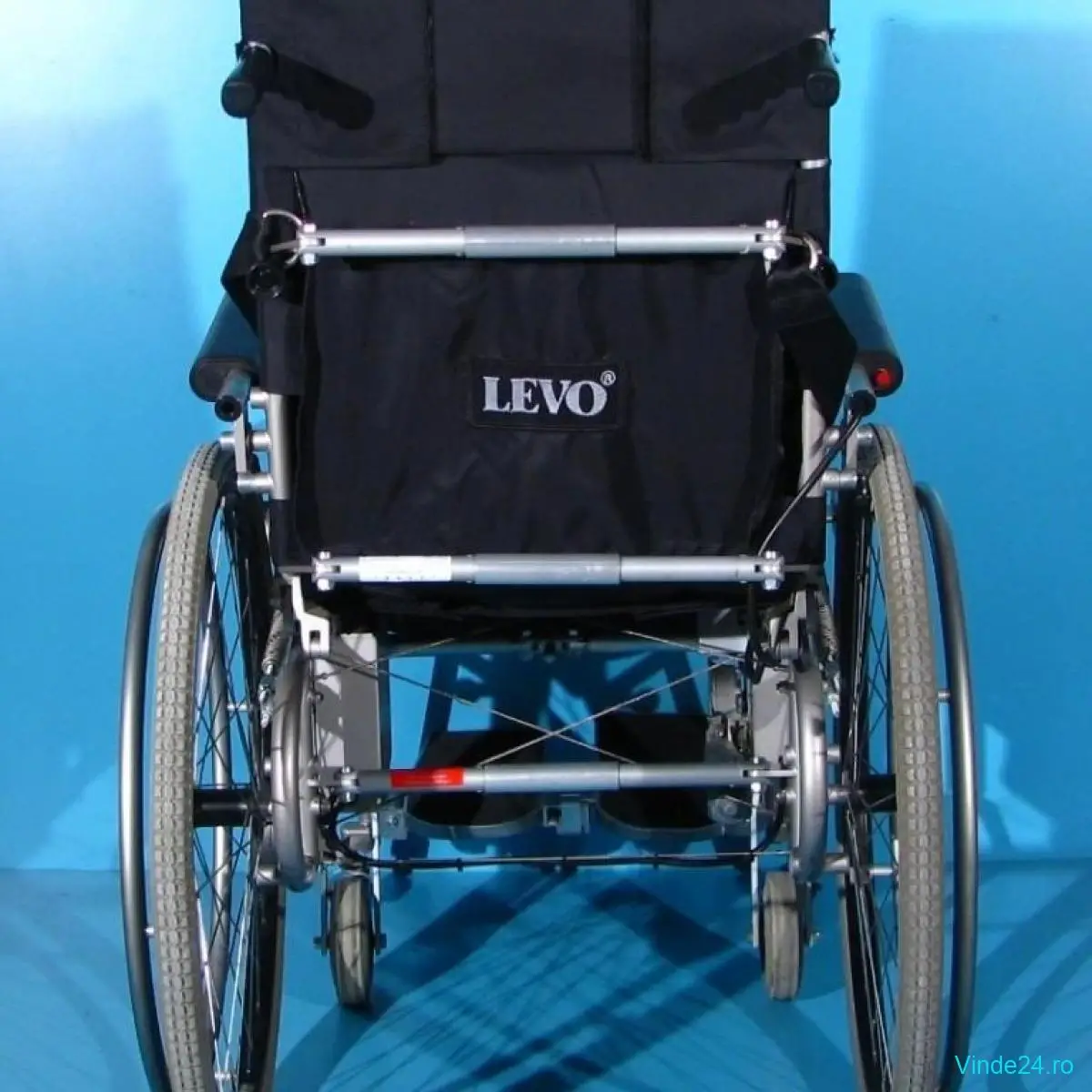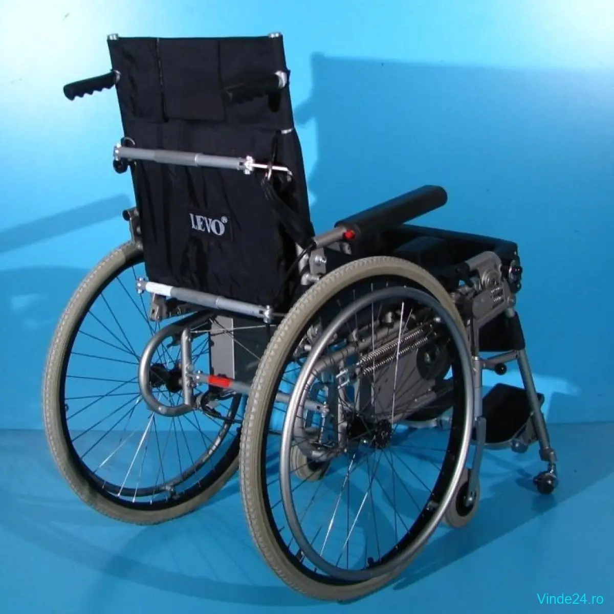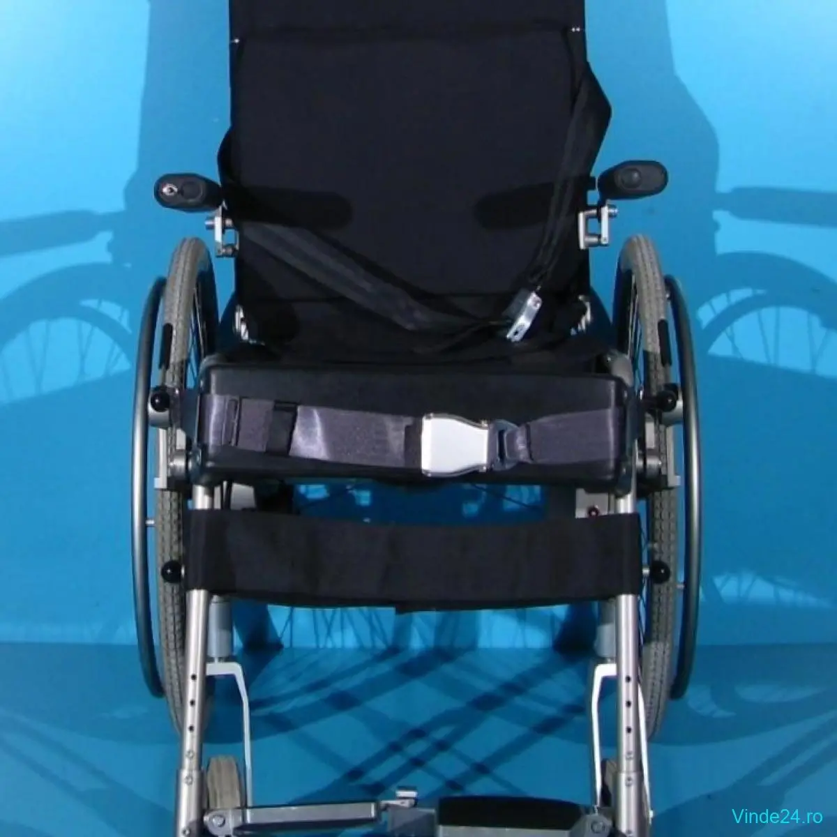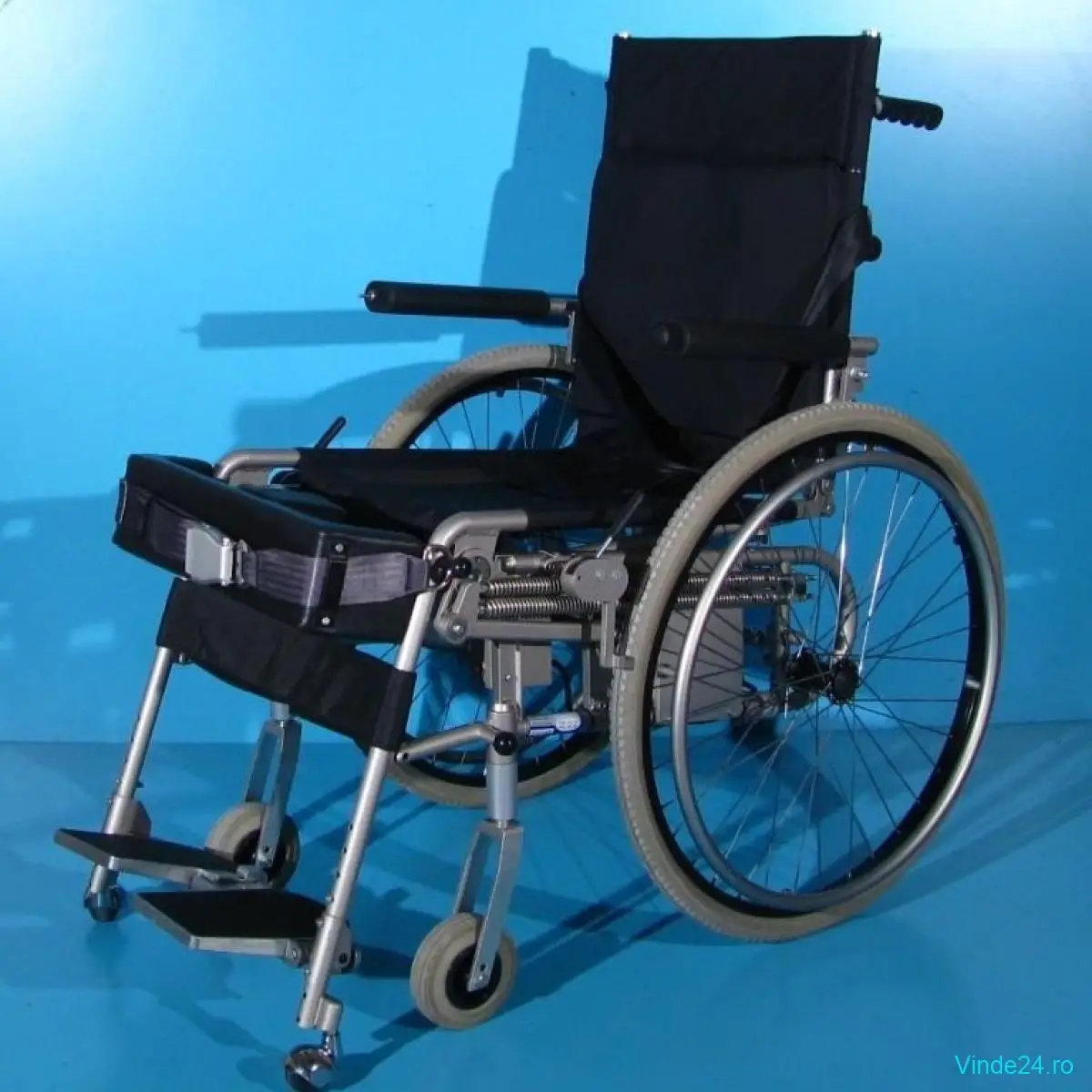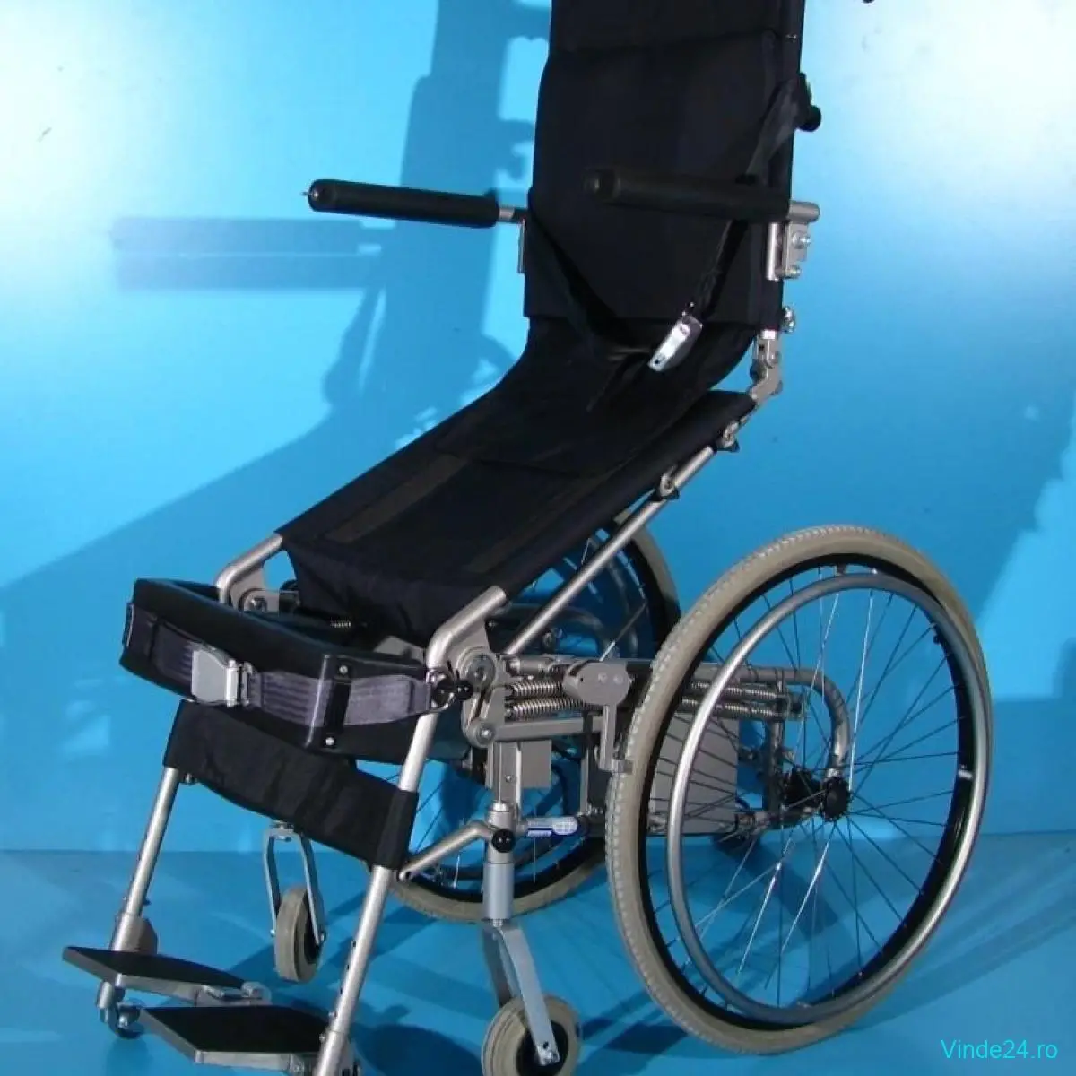 Scaun cu rotile pliabil cu verticalizare electrica second-hand destinat persoanelor cu afectiuni locomotorii.