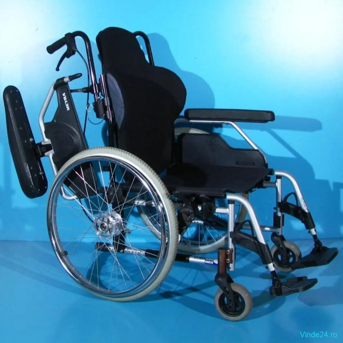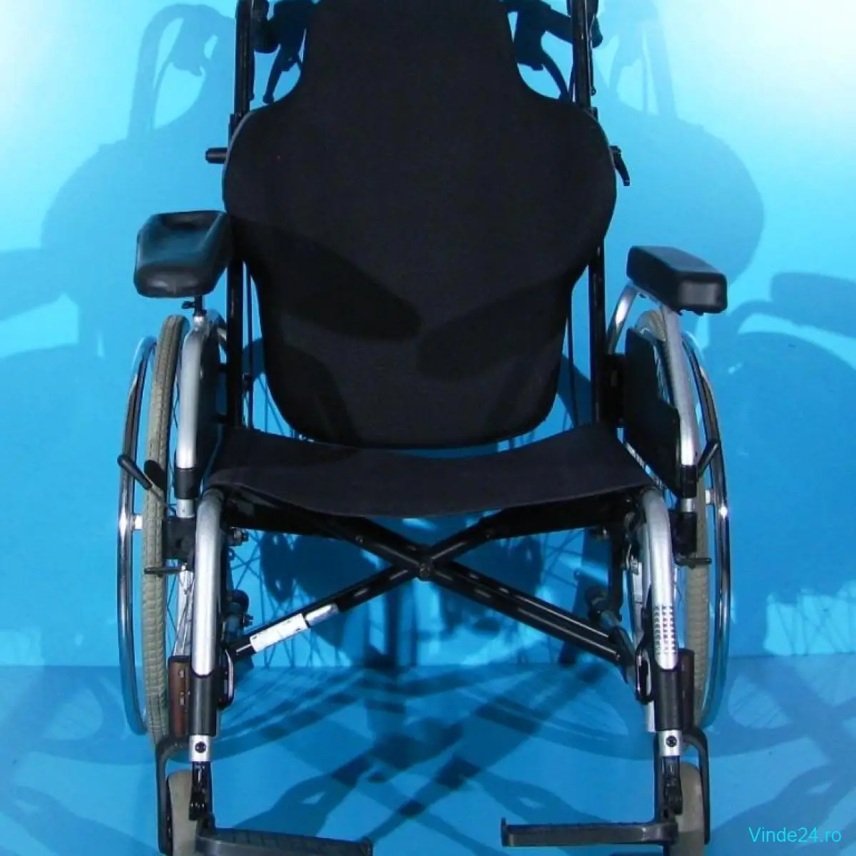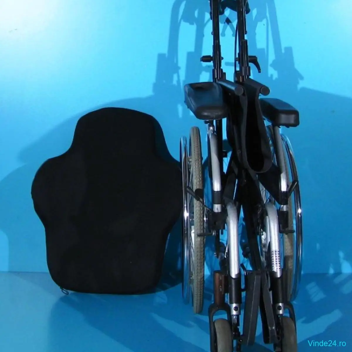 Carucior handicap second-hand, pliabil (dupa detasarea spatarului), cu detașarea rapidă a roților, destinat persoanelor cu mobilitate redusă.