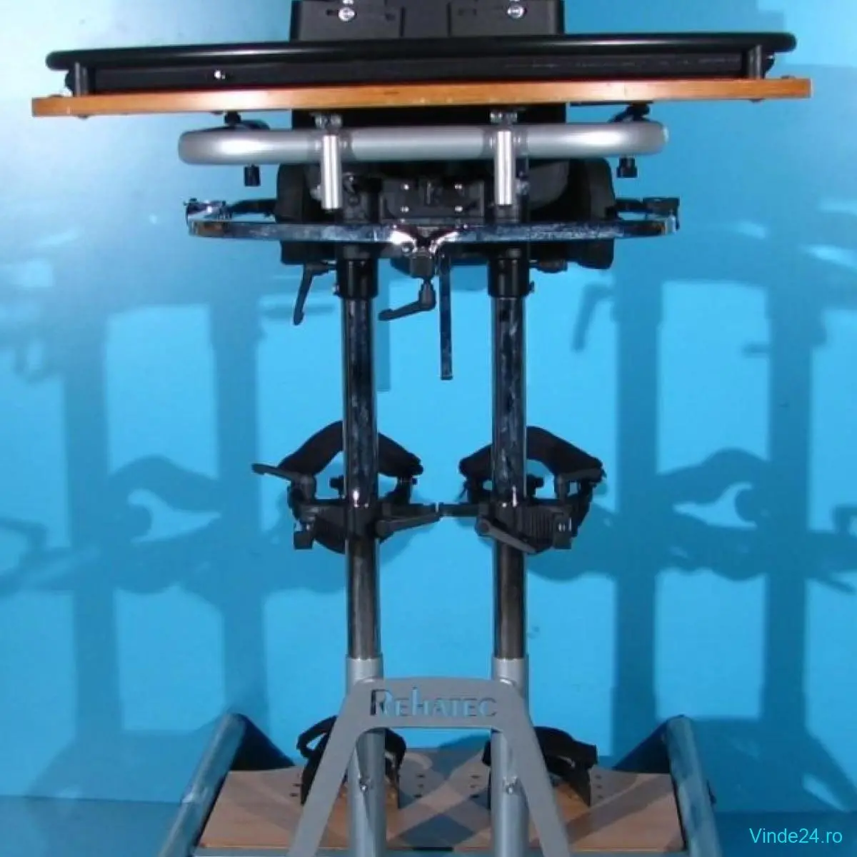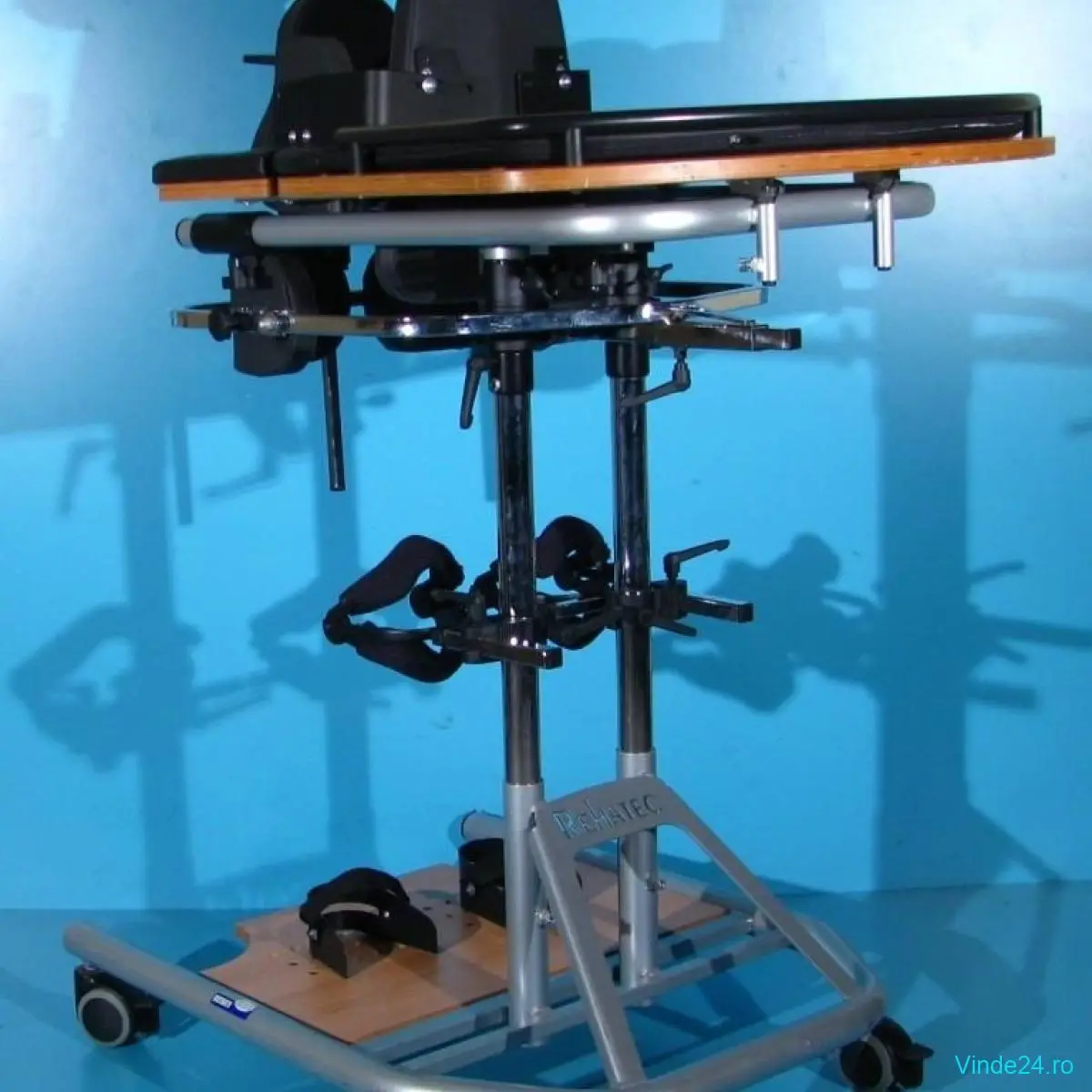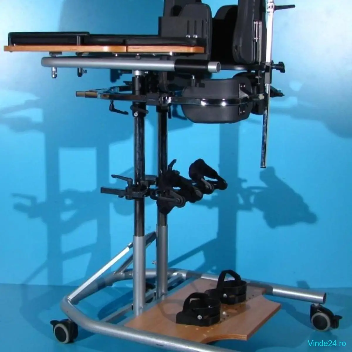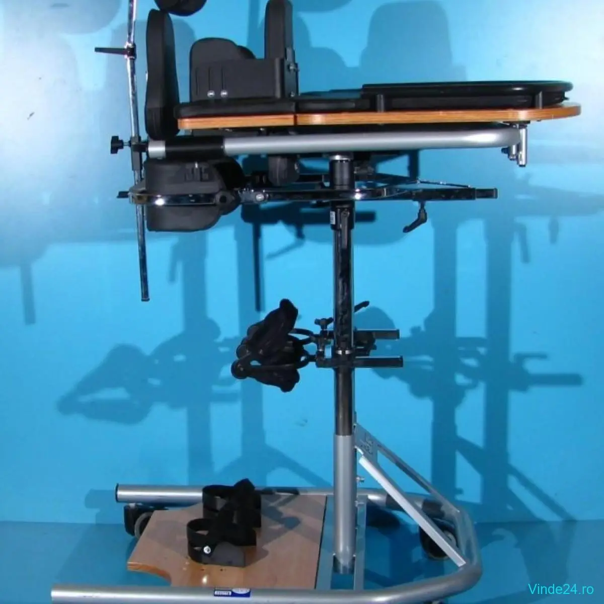 Suport sustinere bazin rabatabil si reglabil fata spate si pe inaltime. Suportul de sustinere bazin permite asezarea persoanei in verticalizator cu ajutorul unei manete actionate de 2 parghii.