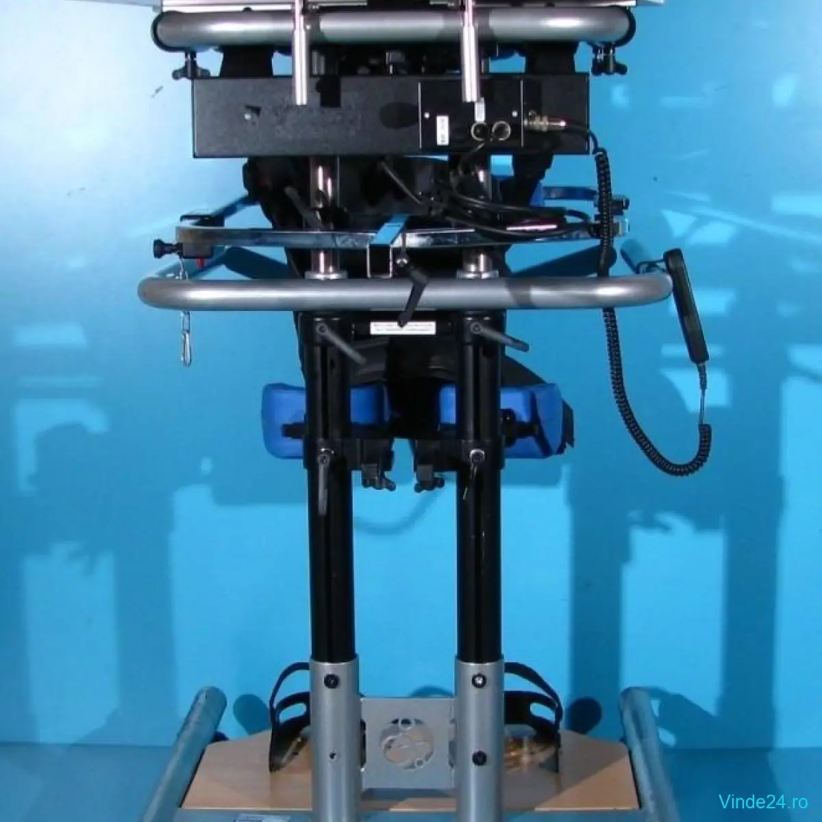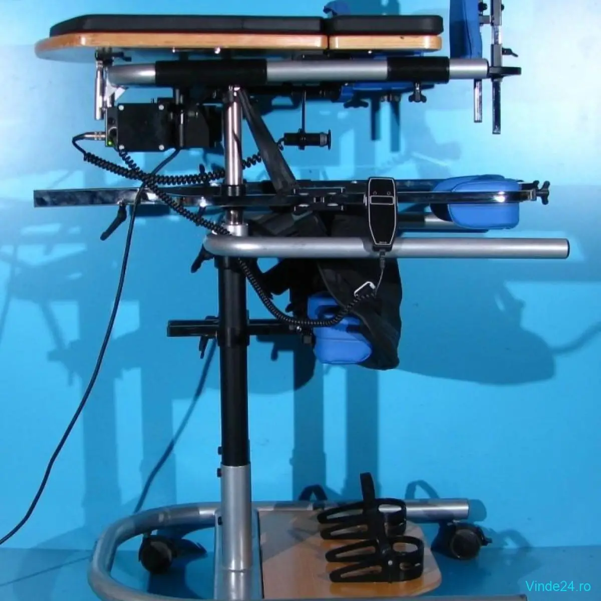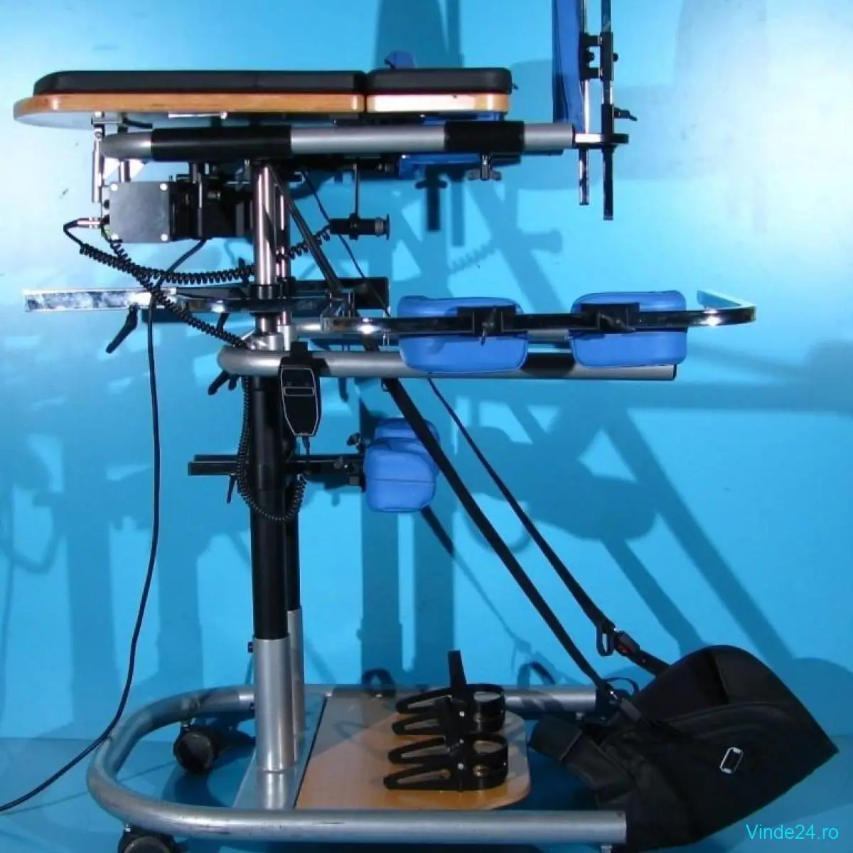 Verticalizator dotat cu frane pe toate cele 4 roti, si suporti talpi reglabili prevazuti cu sustinere calcai si cu prindere pe scai.