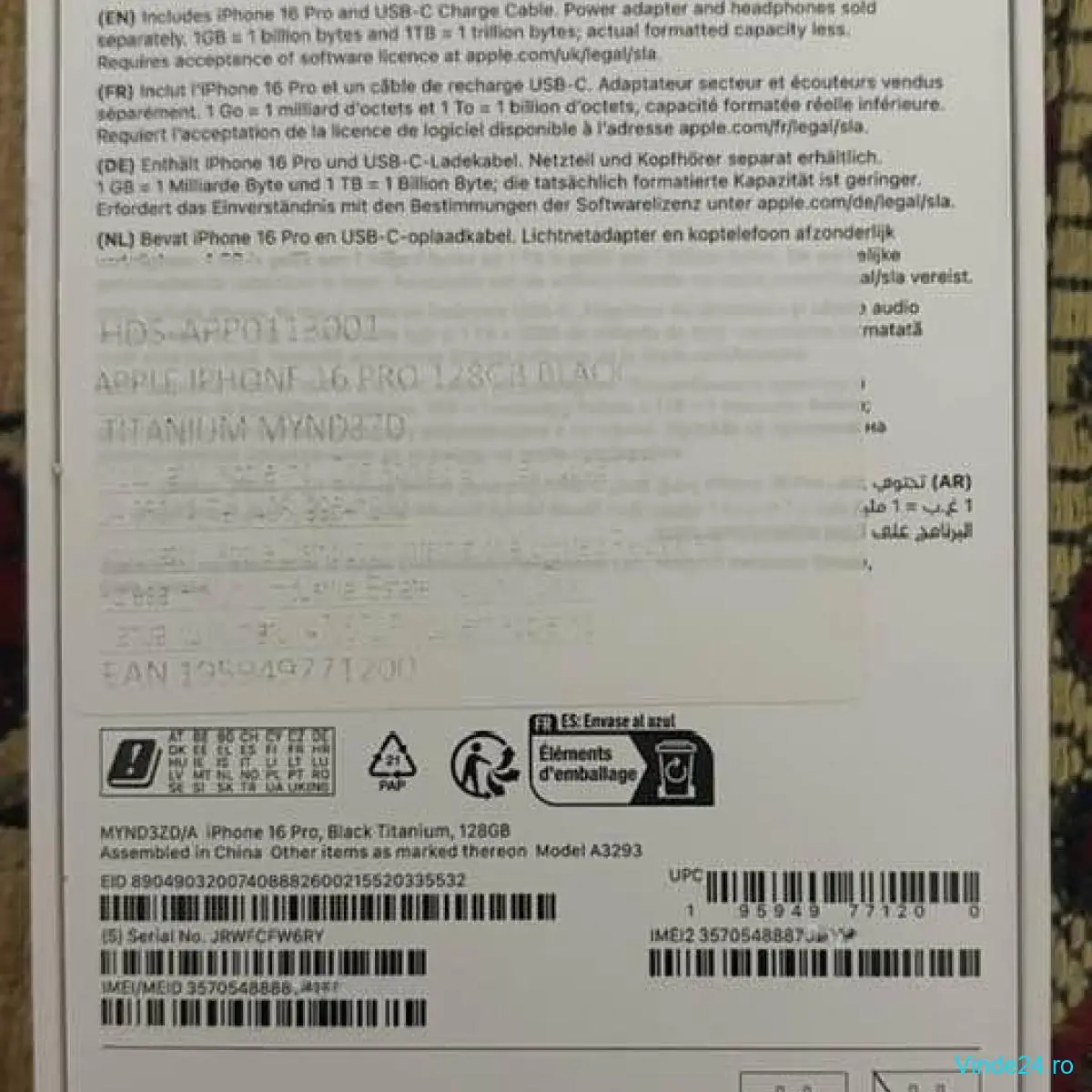 Vând iPhone 16 Pro, culoare Black Titanium, capacitate 128 GB *Stare: NOU, sigilat din fabrica *Model: iPhone 16 Pro (A3293) *Culoare: Black Titanium *Stocare: 128 GB *Liber de rețea *Neactivat -niciodata desfăcut *Fără factura si fara garantie *Cutie originala, sigilii intacte ( se vede in poze) *Nu fac schimburi