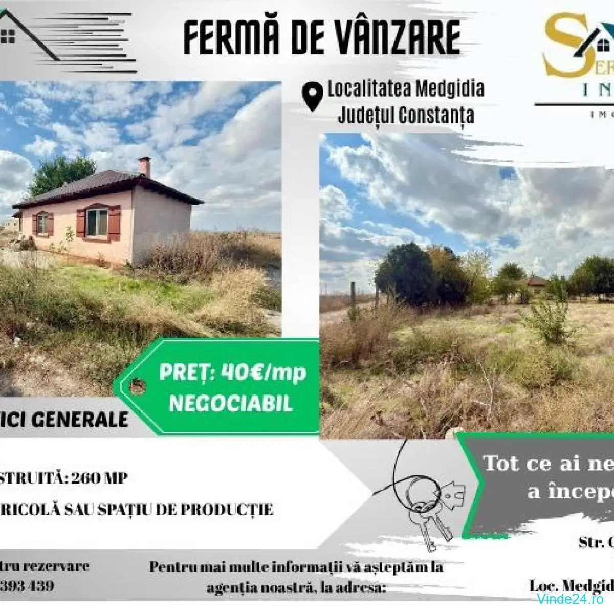 De vânzare – Fermă în Medgidia, zona Tortomanu Locație: Ferma 9, Medgidia, spre Tortomanu Suprafață teren: 7.401 mp Suprafață construită: 260 mp Proprietatea oferă multiple oportunități pentru dezvoltare agricolă, zootehnică sau investițională. Acces facil la drumuri și poziționare într-o zonă liniștită, cu potențial de creștere. Documentație la zi Posibilitate de extindere și valorificare a terenului Ideală pentru exploatație agricolă sau spațiu de producție Pret 40 euro negociabil/mp Comision 0% pentru cumparator!!! Posibilitate de vanzare si in loturi!