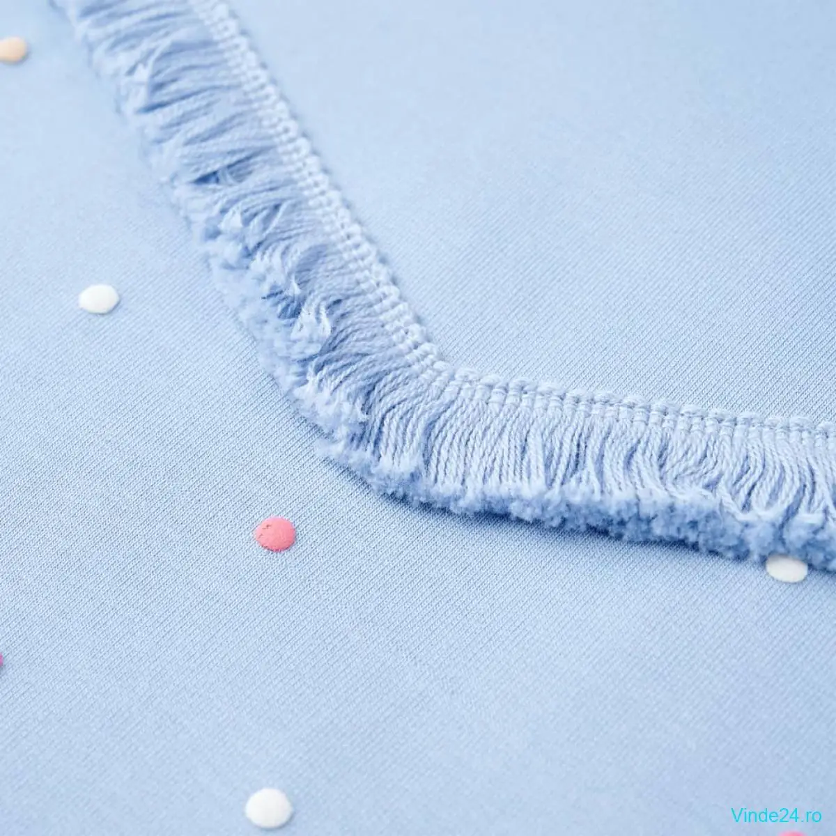 Acest bluzon pentru copii are decolteu rotund, mâneci lungi, buline colorate și franjuri. Acest bluzon albastru, este realizat din 95% bumbac și 5% elastan, fiind moale și confortabil la atingere.