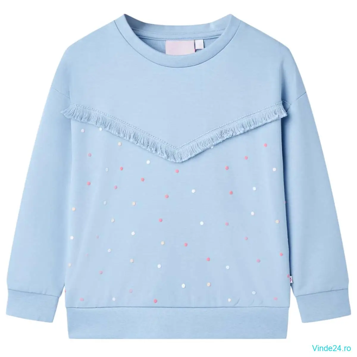 Acest bluzon pentru copii are decolteu rotund, mâneci lungi, buline colorate și franjuri. Acest bluzon albastru, este realizat din 95% bumbac și 5% elastan, fiind moale și confortabil la atingere.