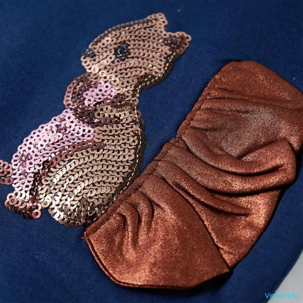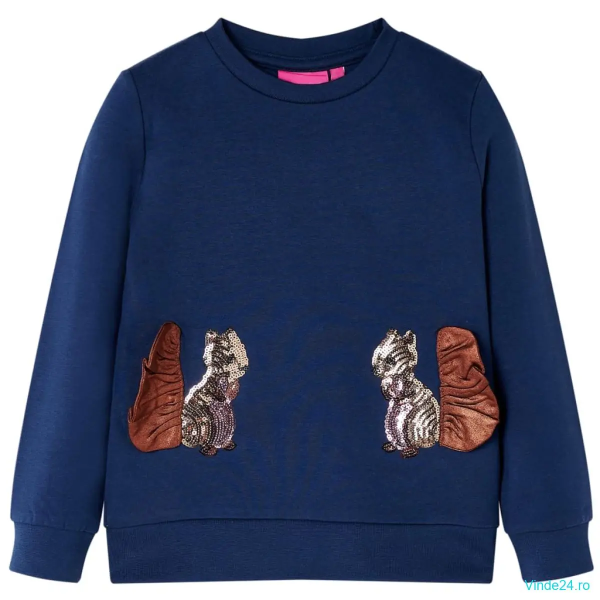 Acest bluzon pentru copii are mâneci lungi, decolteu rotund și margini cu model din elastic împletit la manșete, în jurul gâtului și în partea inferioară. Bluza pentru copii are o frumoasă culoare bleumarin cu 2 veverițe cu paiete, adăugând un plus de distracție. Bluzonul pentru copii este confecționat din 95% bumbac și 5% elastan, pentru confort și respirabilitate. Căptușeala moale din fleece oferă un plus de căldură.